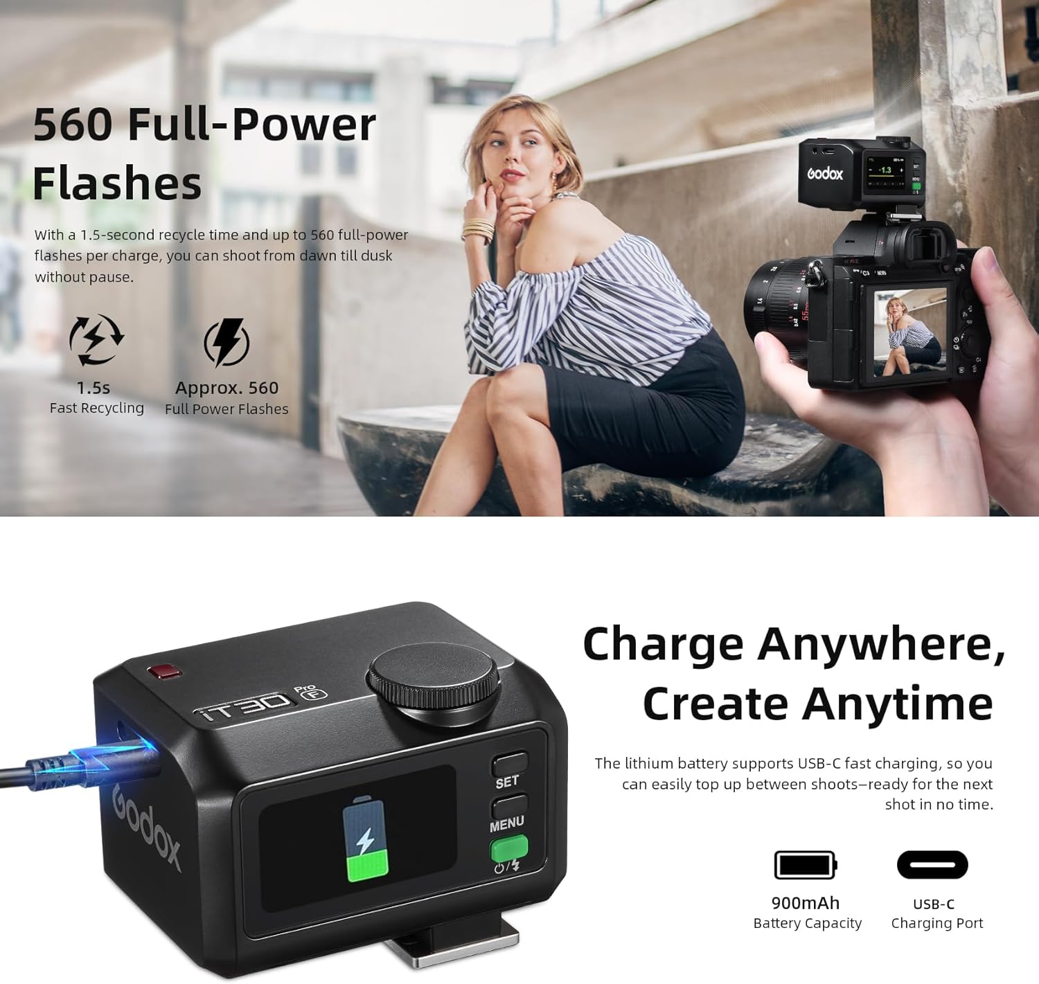 [Built-in 2.4GHz X Wireless + Touchscreen: Acts as X3 Trigger, Controls 3 External Flash Groups]: The Godox iT30 Pro-F integrates X3 trigger functions with 2.4GHz wireless (100m range, 32 channels) and a touchscreen. It independently controls 3 external flash groups via tap/swipe—no extra triggers needed.