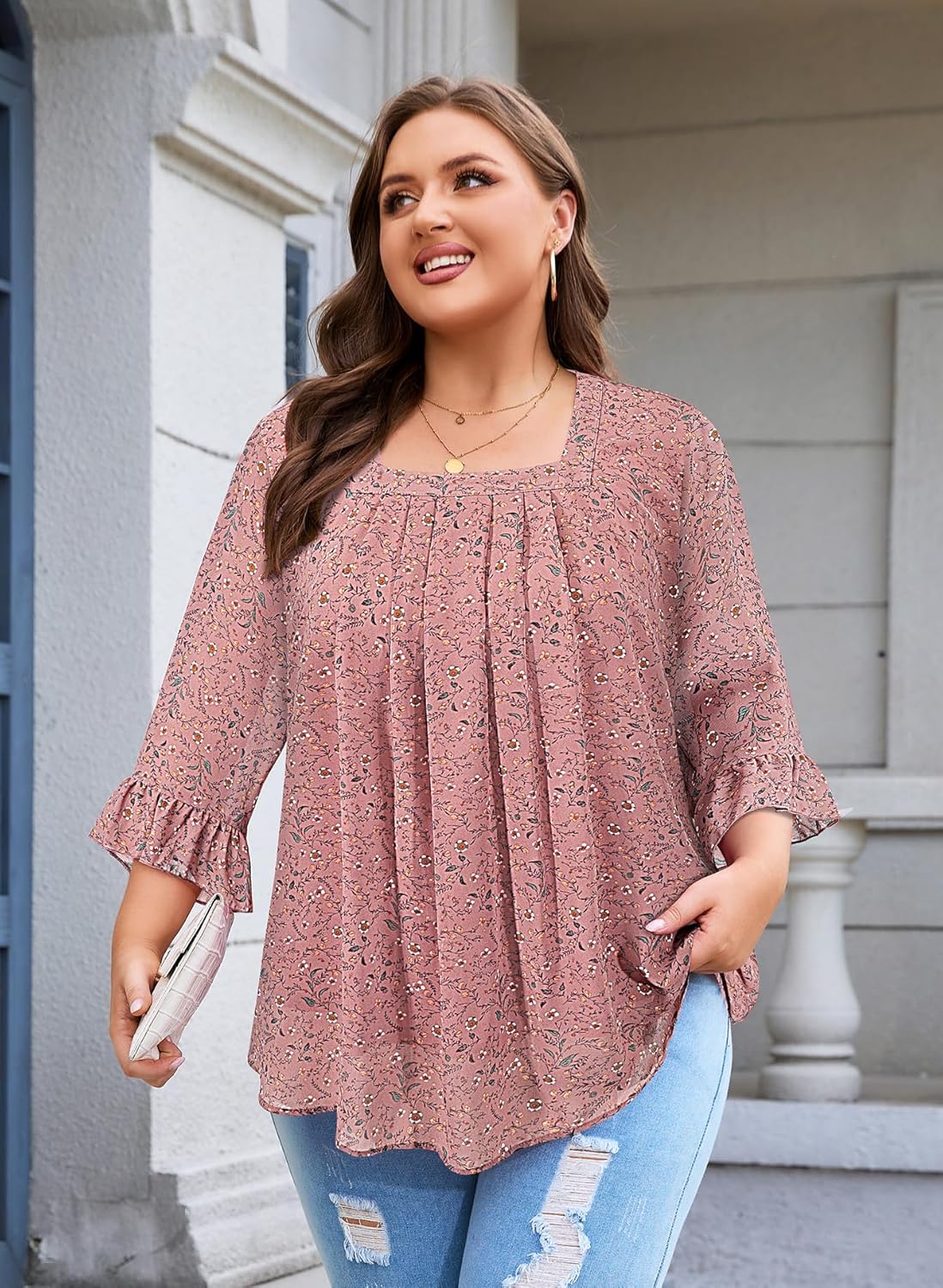 Siddhe Plus Size Chiffon Tops for Women Short Sleeve Square Neck Summer Dressy Blouses Loose Tunic