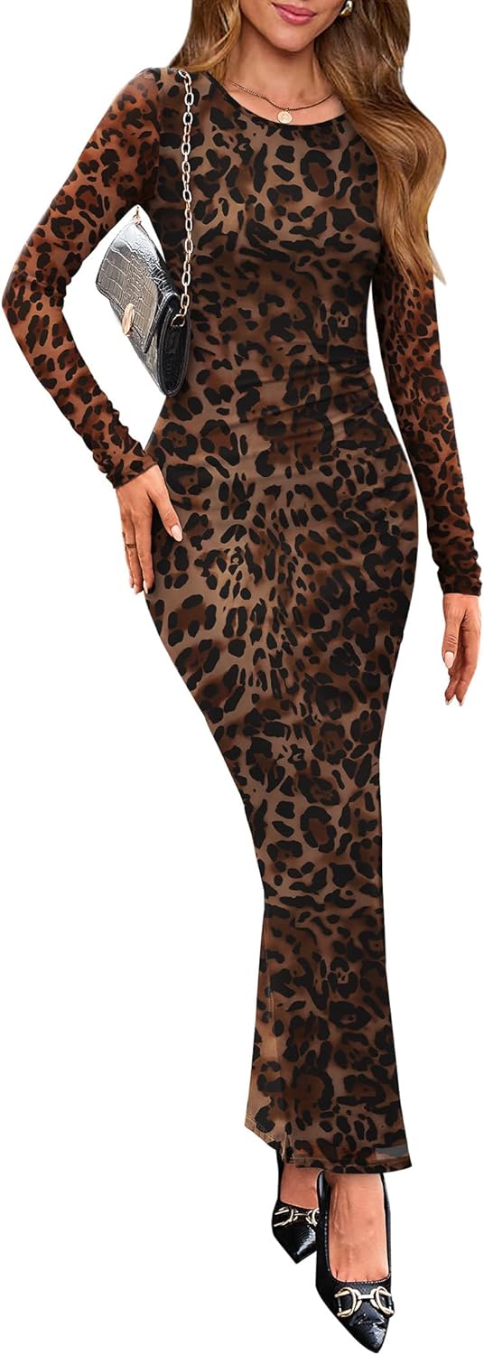 WIHOLL Women's Bodycon Maxi Dress Fall Fashion Long Sleeve Floral Print Tight Fitted Party Club Ruched Dresses