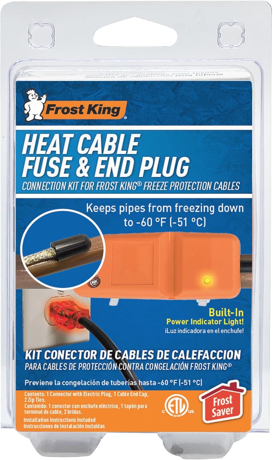 Control for freeze protection products. This kit provides the specially designed fused Plug, to connect one freeze free heater cable into an electrical outlet, and a cable end seal. Some Plug assembly is required. The freeze free system is for use on insulated domestic water pipes only. Do not use cable where it can get wet; on buried pipes; on pipes carrying any fluid other than water or for any non-pipe heating applications. Keep your pipes from freezing in the winter. With a built-in thermostat, the Frost King electric heat cable kit automatically keep your water pipes from freezing, works at temperatures down to 38 degrees below zero. The fused Plug kit is for use with freeze-free pipe heating cable. This Plug and end seal is made of heavy-duty plastic and offers an on/off indicator light for safety. Application: heating cable product type: connection kit CSA listed: Yes self regulating: Yes UL listed: Yes voltage: 120 Volts wattage: 225 watts connection kit, contains: Plug, gel, end seal & instruction sheet for use with freeze free system supports up to 75 feet of freeze free cable for plastic & metal pipes built in fast reaction fuse power indicator light indicates an intact fuse grounded 30 inches cord set requires less heating cable pipe mounting brackets for easy attachment to typical water pipes easy installation protects pipes to -60 degrees, F, -51 degrees