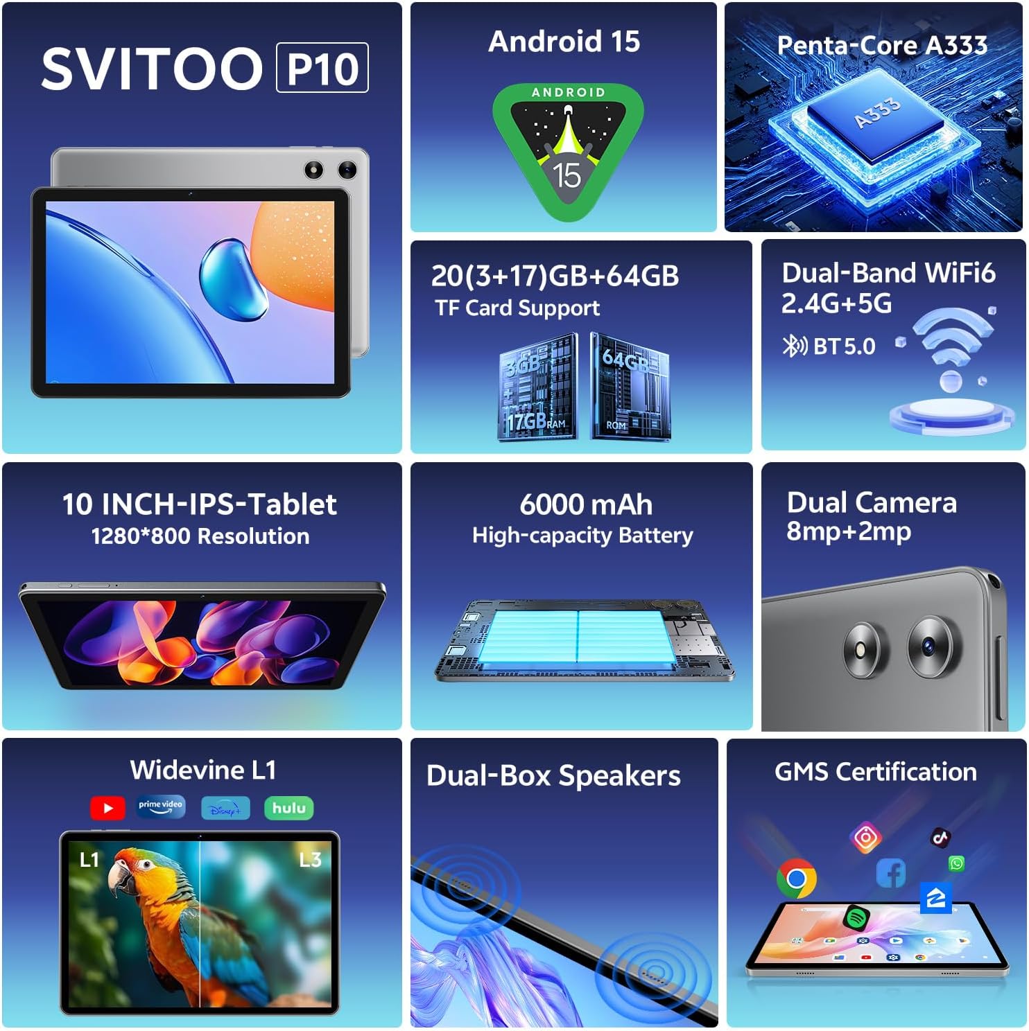 Android Tablet 10 Inch, 2025 Android 15 Tablet for Kids Adults, 20GB RAM 64GB Storage 1TB Expandable, Dual Cameras 8MP 2MP, 6000mAh Dual Speakers WiFi 6