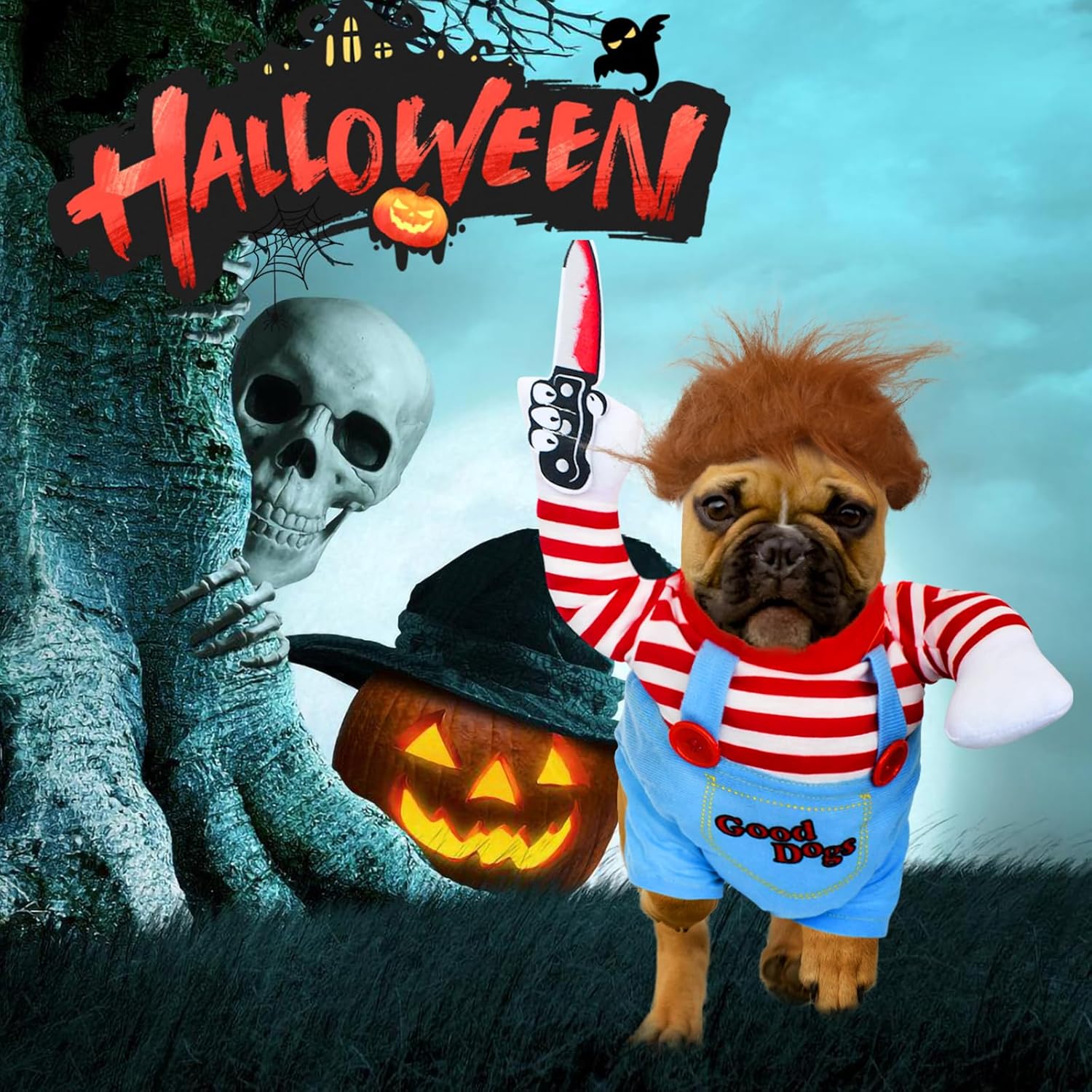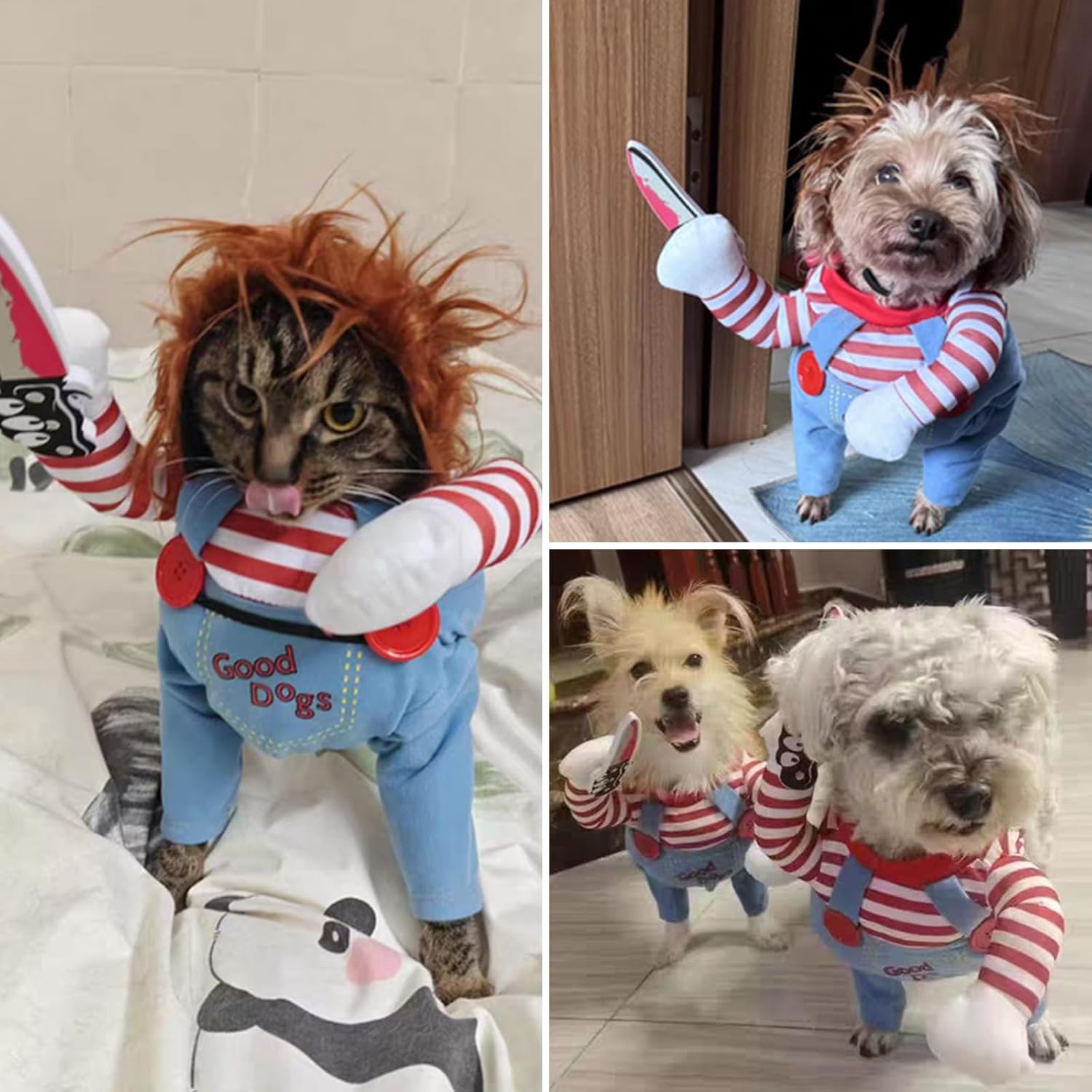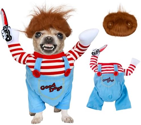 【Spooky Deadly Doll Design with Knife & Wig】: Transform your pet into a hilariously eerie star with this dog halloween costume! Features a detachable foam knife and a funny wig, plus 3D padded arms & classic striped top-overalls. Perfect for blending "scary" and "cute" vibes at parties or photoshoots.
