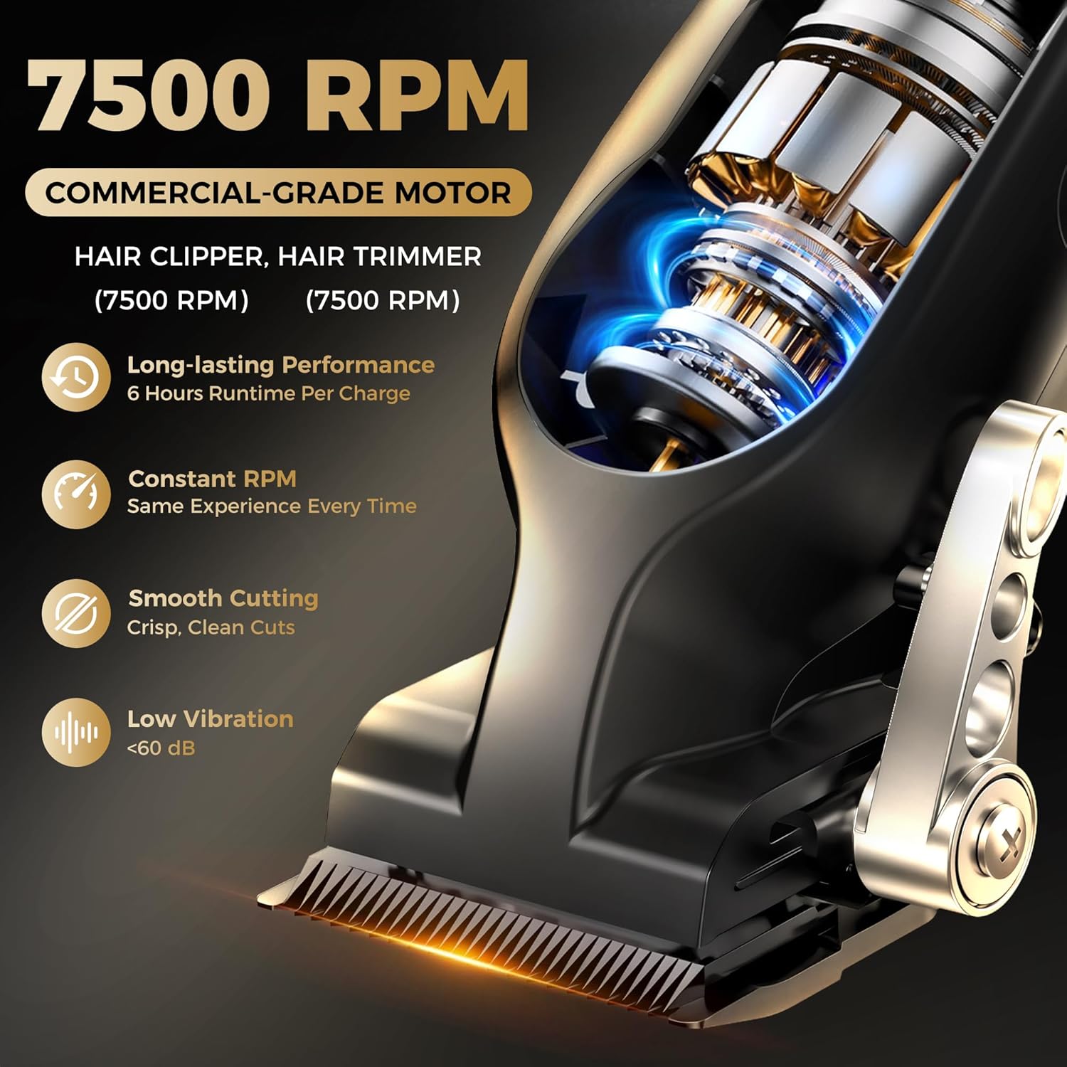BARBER-APPROVED MOTOR: Our barber set equips high torque motors that provide a constant 7,500 RPM on both the clipper and trimmer. These motors ensure stability, delivering perfect cutting performance with no stalling or jamming. Exclusively built for all-day barbering: the clipper and trimmer keep their power strong through hours of continuous use — no slowdown, no fading performance.
