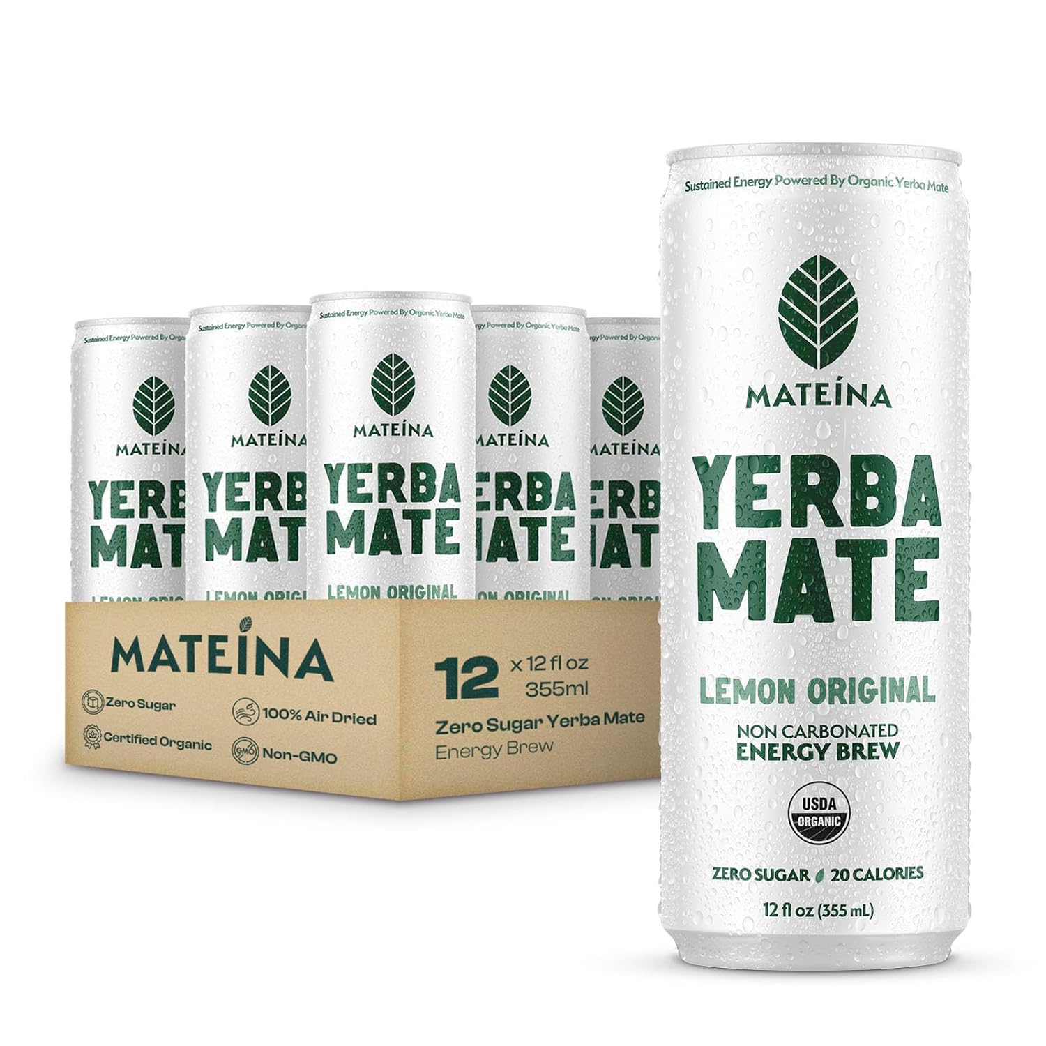 Mateina Yerba Mate Zero Sugar Energy Drink – 120mg Natural Caffeine – Organic, Non-GMO, Non-Carbonated – Dr. Andrew Huberman Recommended – 12 Pack (12oz Cans) (12 Pack, Lemon Original)