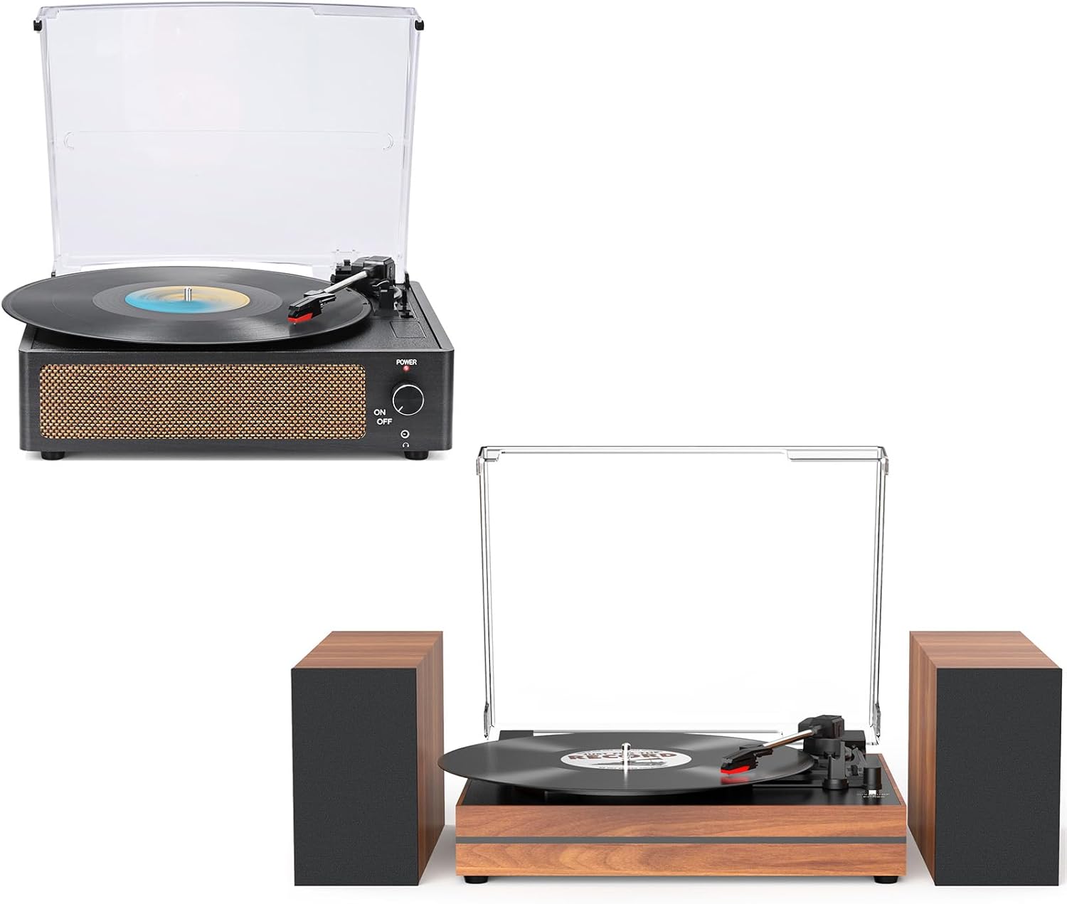 Record Player with Bulit-in Two Speakers Black and Record Player with Two External Speakers Walnut Red