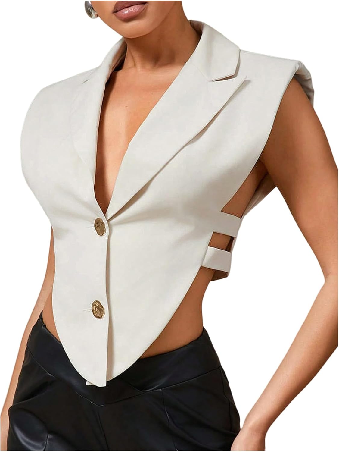 WDIRARA Women's Button Down Shoulder Pad Asymmetrical Tank Top Lapel Neck Sleeveless Suit Vest