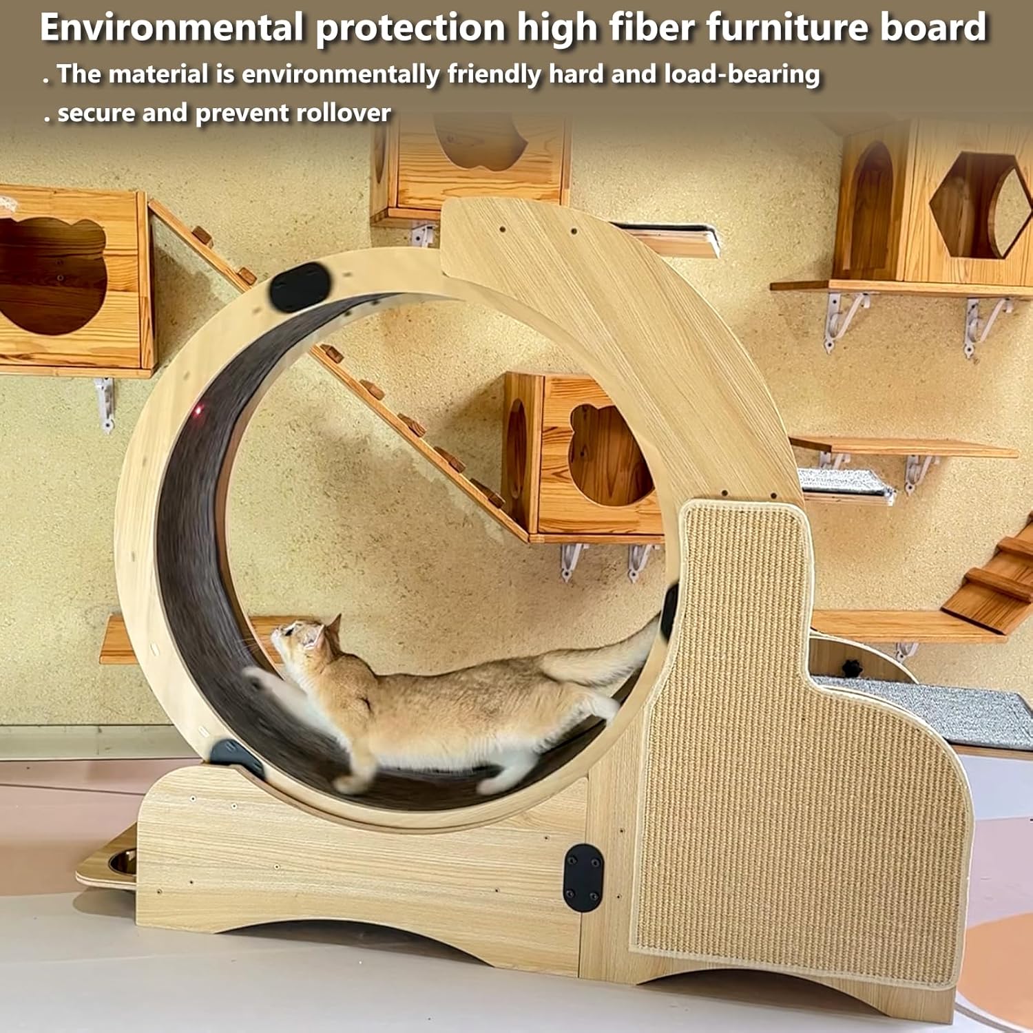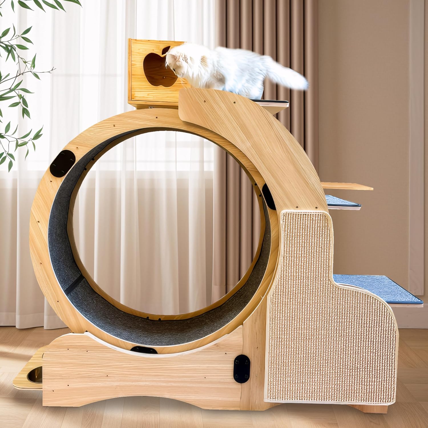 🎯 【5-IN-1 MULTIFUNCTIONAL DESIGN】Combines exercise wheel, cat house, climbing shelf, food station, scratch board,in pet-safe natural wood.
