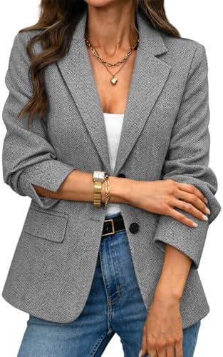 ELLEVEN Women’s Herringbone Tweed Blazer – Slim Fit Business Casual Work Jacket with Flap Pockets, Long Sleeve