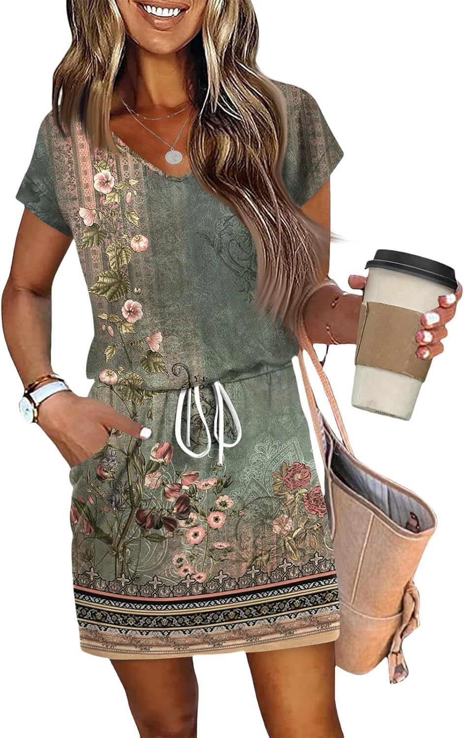 Womens Casual T Shirt Dress Summer Short Sleeve Cotton Cinched Waist Dress with Pockets Beach Vacation Outfits
