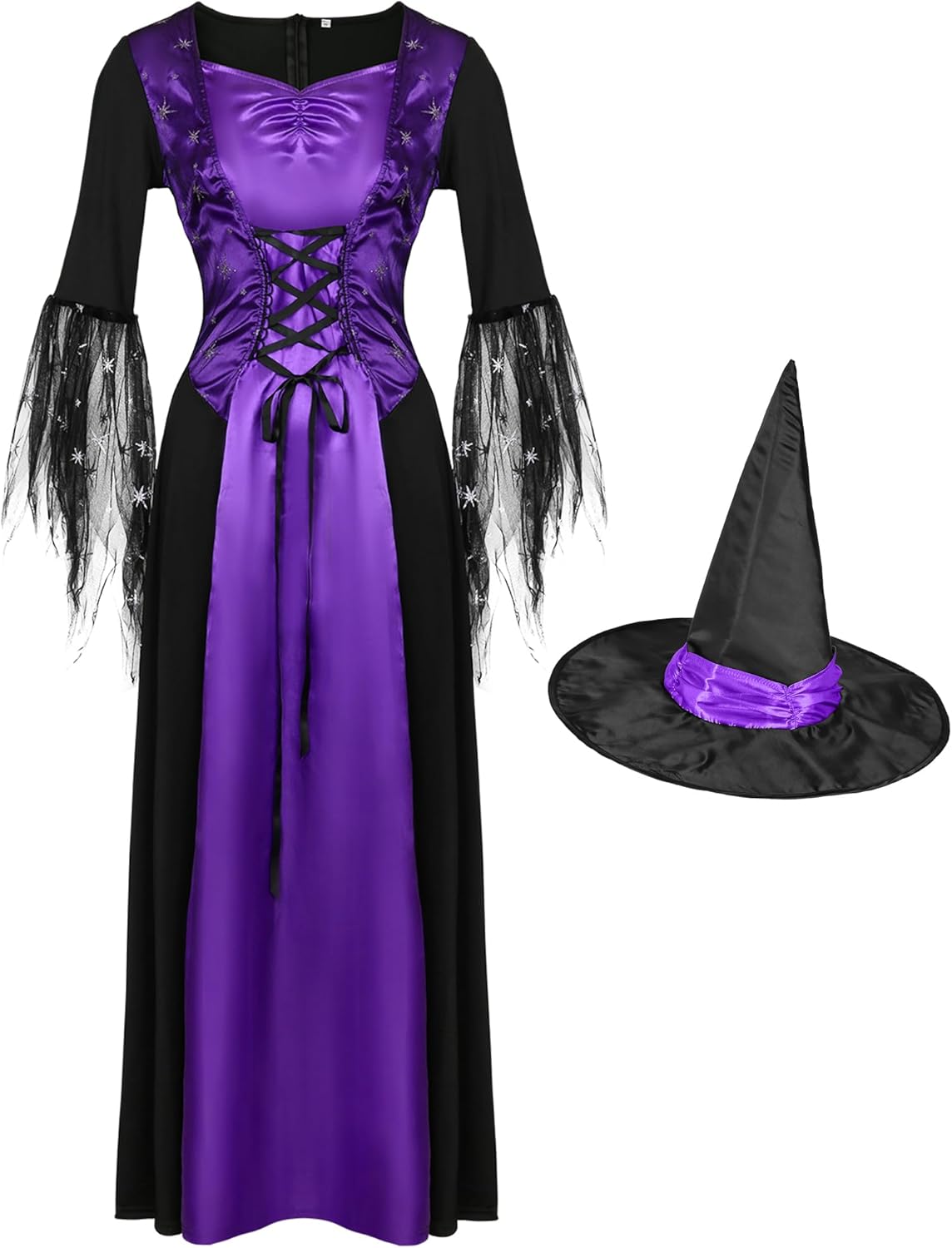 Witch Costume Women with Wicked Witch Hat Long Purple Dress For Halloween Adult Outfits