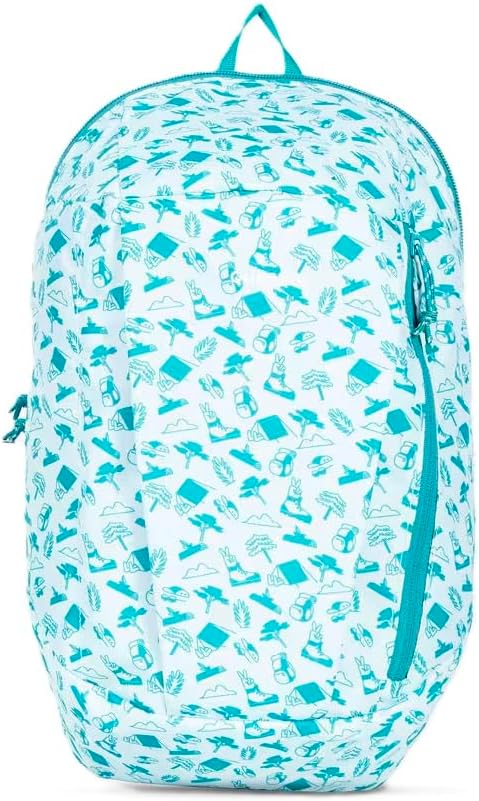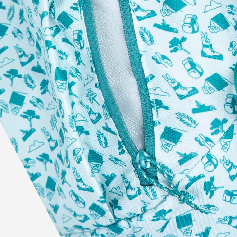 Discover the perfect companion for your day hikes with this charming 10L backpack featuring a delightful outdoor-themed pattern in turquoise blue. The playful white illustrations showcase camping essentials, hiking boots, trees, and adventure motifs against the rosy background. This compact daypack combines style with functionality, featuring a spacious main compartment with a smooth-running white zipper, comfortable cream-colored shoulder straps, and a padded back panel for all-day comfort. The durable fabric construction ensures your gear stays protected, while the sleek design maintains a lightweight profile ideal for short trails or casual outings. The contrasting white trim and zipper pulls add a sophisticated touch to the whimsical pattern. Whether you're heading out for a nature walk or need a reliable bag for daily adventures, this backpack offers the perfect blend of practical storage and outdoorsy charm.