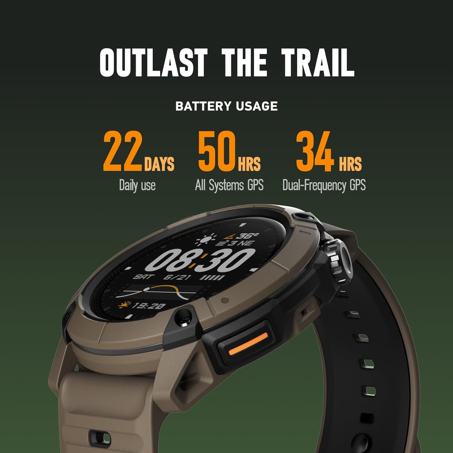 Outlast the trail: With weeks of battery life and a rugged, lightweight design, this ultimate Sports GPS watch ensures you'll run out of trail before you run out of juice: 50 hours of GPS battery life and 22 days of daily use.