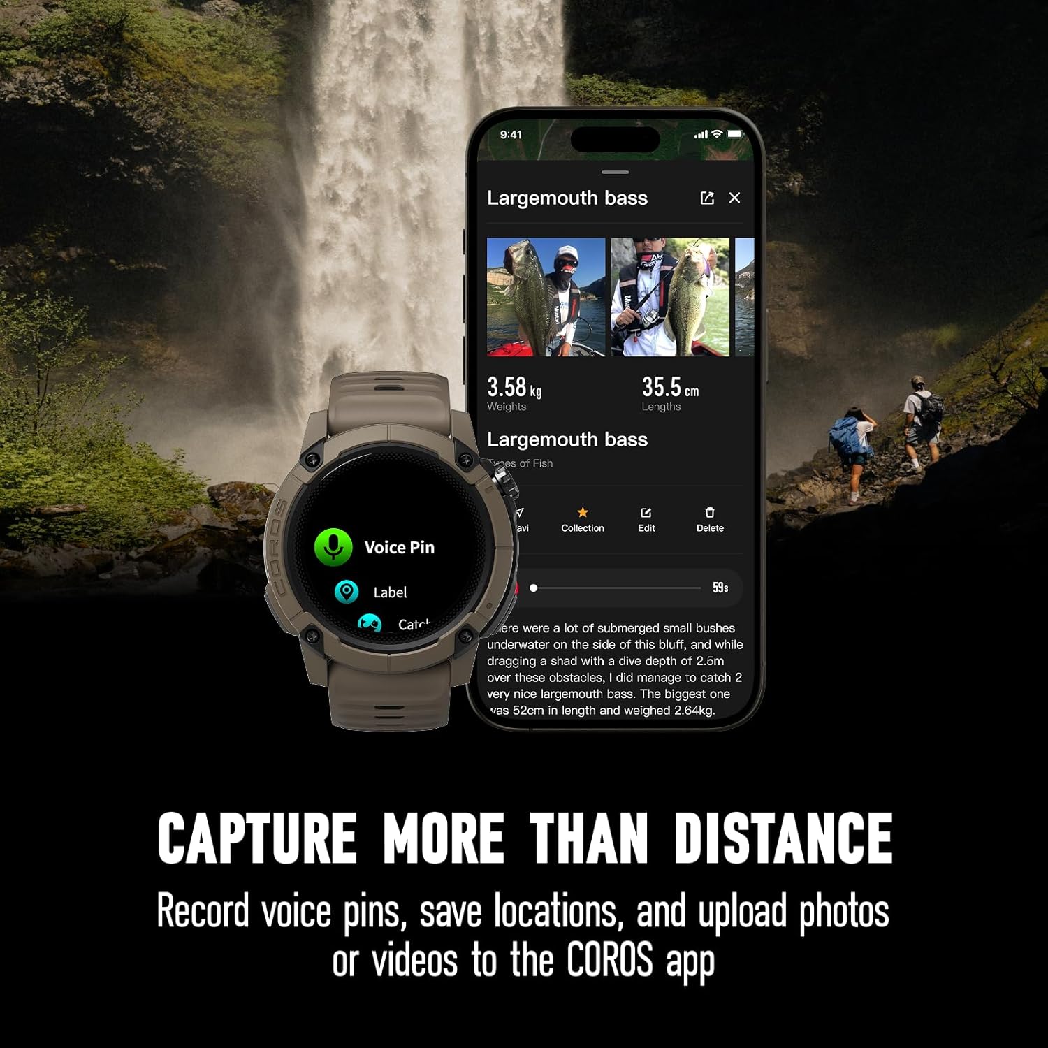 Catch every adventure: Get real-time and forecasted data like sunrise, tides, and moon phase. Use COROS NOMAD Sports GPS Watch, the angler's trusted Outdoor GPS Watch, to log catches and mark key spots.