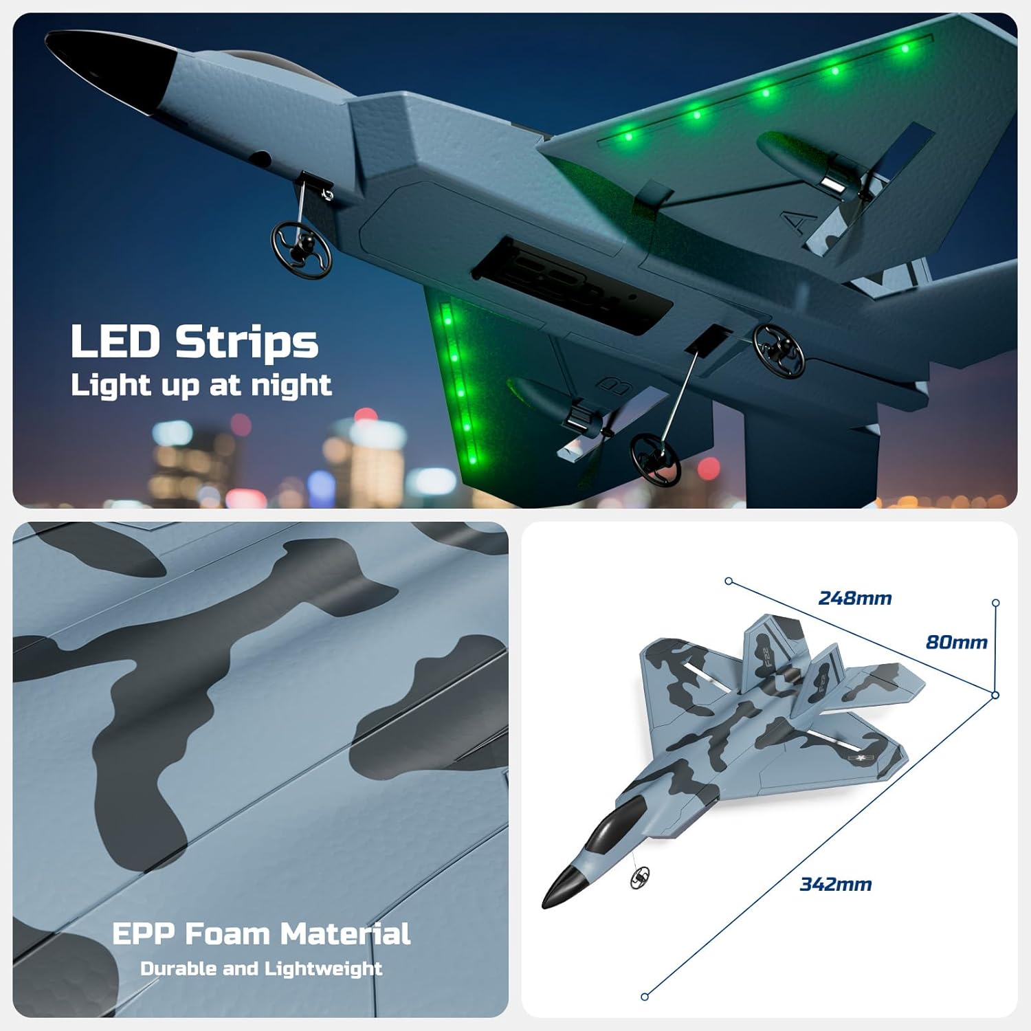 F-22 Fighter for Kids: This aircraft capture the essence of F-22 fighter and completely constructed of EPP foam, it is extremely lightweight and durable. Feature with bright LED lights provide great visuals for the nighttime flight, sure to please rc enthusiasts of all ages!