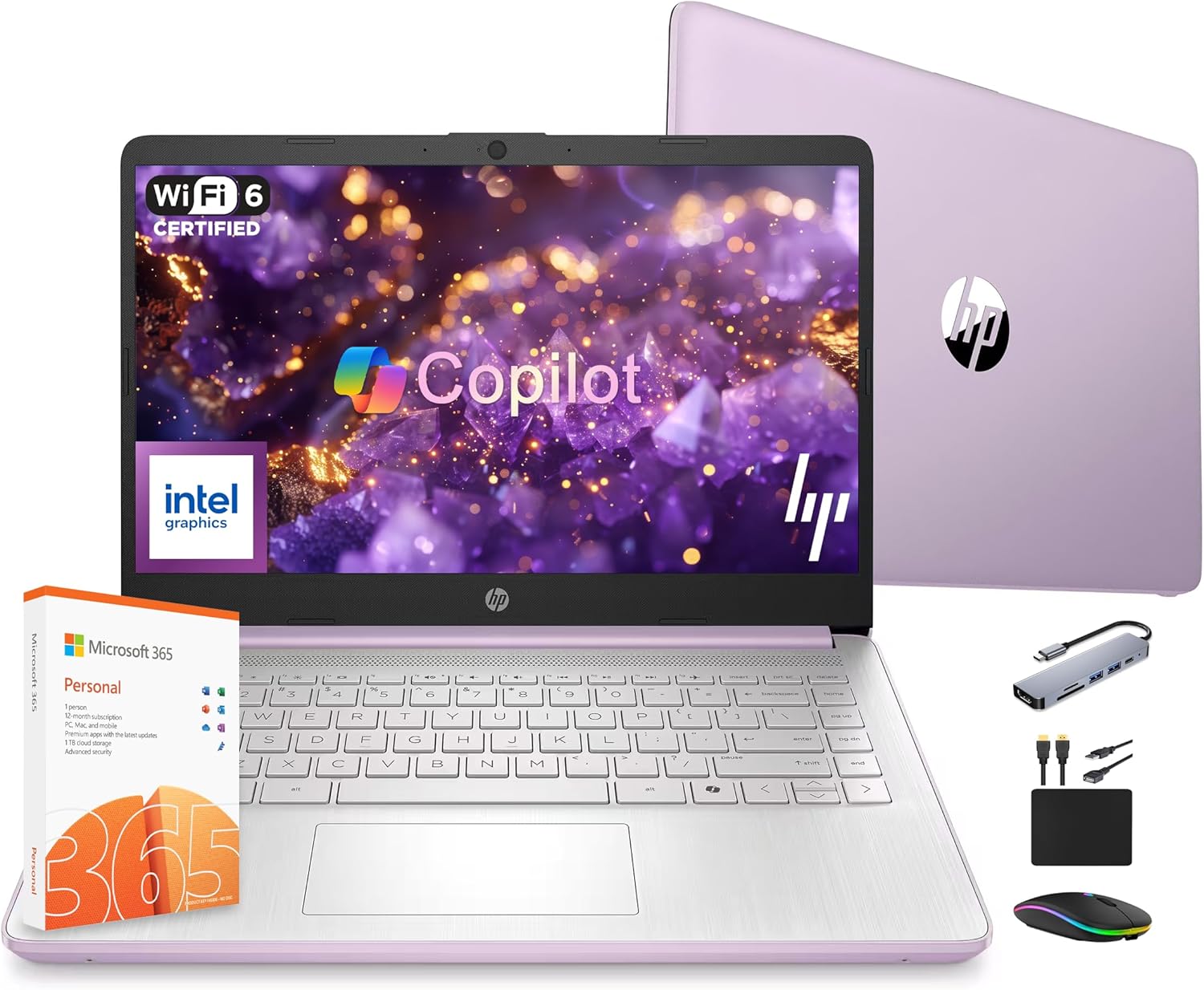 HP 14 Laptop Computer 2025 Ultra Light, AI Copilot Student Business, Quad-Core Intel, 16GB RAM, 628GB Storage (128GB UFS+ 500GB Ext), 1 Yr Office 365, 12 Hr Battery MarxsolAccessory Win 11S, Lavender