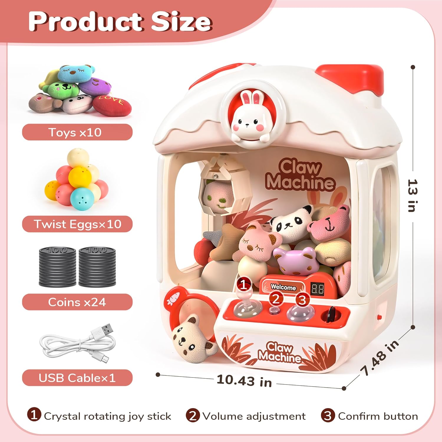 Ready to Play:Kids claw machine,size 10.43 in*7.48 in*13 in,requires no assembly and is ready to use straight out of the box.The adorable design and dazzling lights of this claw machine can stimulate children's curiosity and cultivate their concentration and hands-on skills