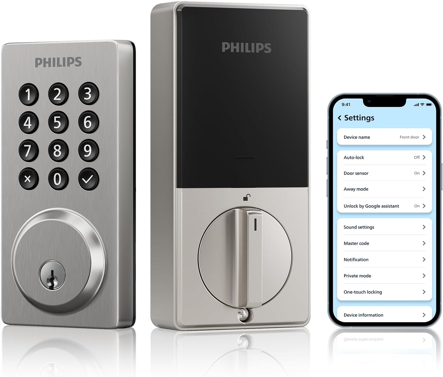 Philips Smart Lock, Smart Door Lock Built-in WiFi, App Remote Control, Keyless Entry Door Lock for Front Door, Deadbolt Lock Auto Lock, Support Alexa & Google, IP54 Waterproof, Satin Nickel