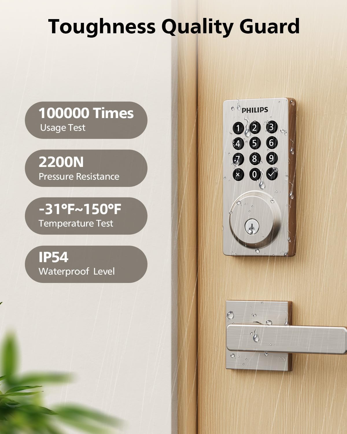 Safe and Durable: The Philips door lock can reliable work in temperatures ranging from -31°F to 150°F (-35°C to 66°C), 2200N pressure resistance and waterproof level IP54. Entering the wrong password multiple times will send alarm prompt, ensure your home safety to the greatest extent possible.