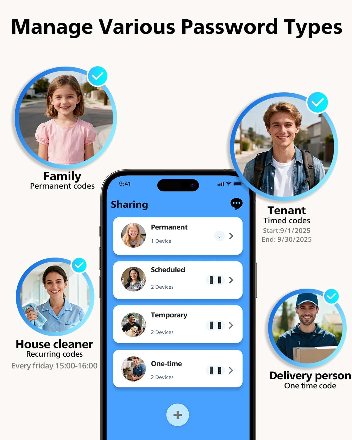 Multiple Password Modes: You can create up to 100 custom passwords. You can set up permanent, one-time, and timed passwords to assign to family, friends, tenants, and cleaners as needed.