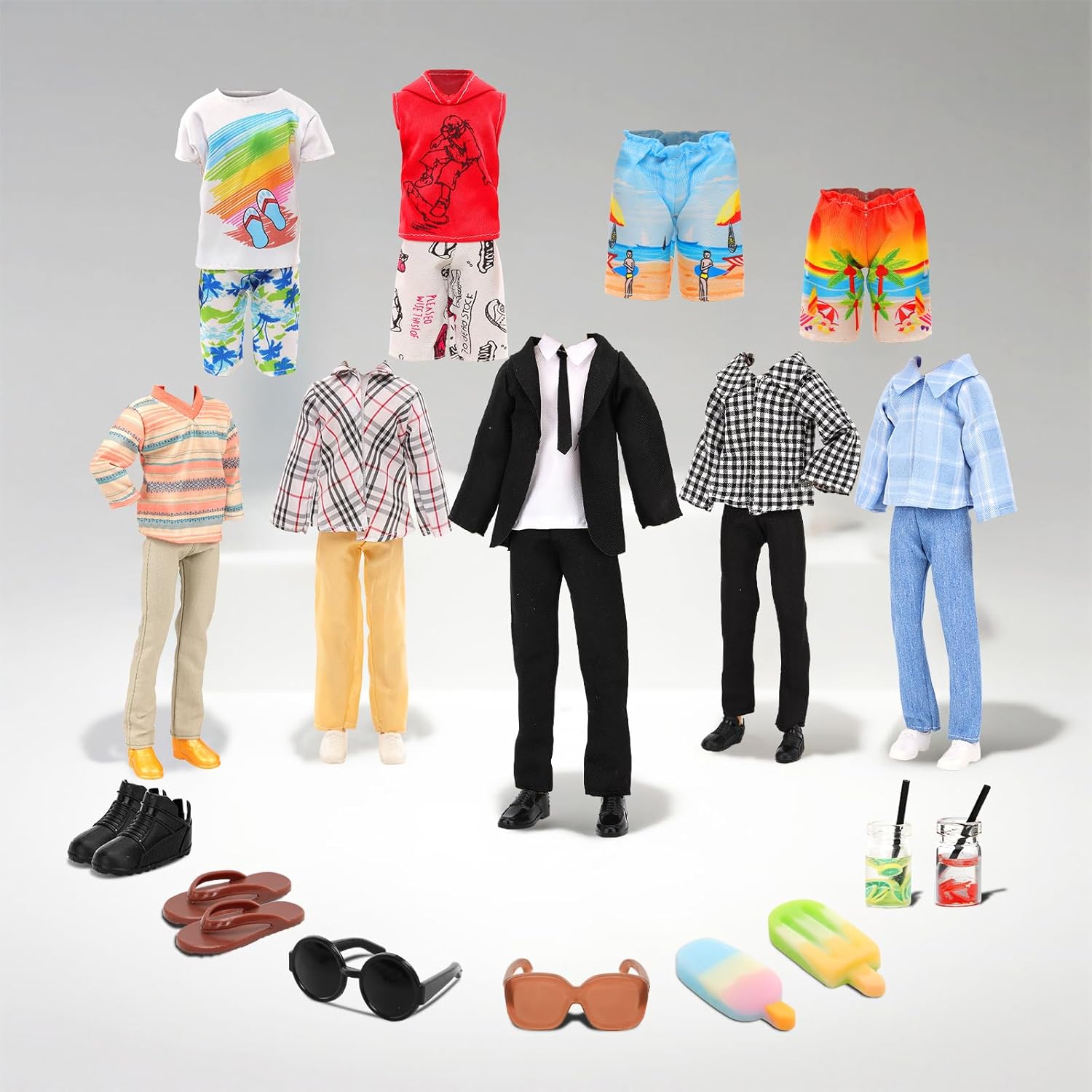 Complete Doll Fashion Wardrobe Give your 11.5" fashion doll endless styling options with this 21-piece bundle! Includes: ✅ 5 Trendy Outfits – Formal suit, casual hoodie set, sporty shorts, swim trunks & more ✅ 5 Matching Shoes – Dress shoes, sneakers, sandals & casual footwear ✅ Stylish Extras – 2 UV-protection sunglasses + 2 snack accessories (ice pops & drinks)  Premium Details Mix-and-match fabrics with realistic details (buttons, pockets, textures) Fits most 11-12" fashion dolls (check measurements) Perfect for playtime, collections, or doll photography  Ideal Gift Packaged ready-to-gift for birthdays, holidays, or doll lovers!