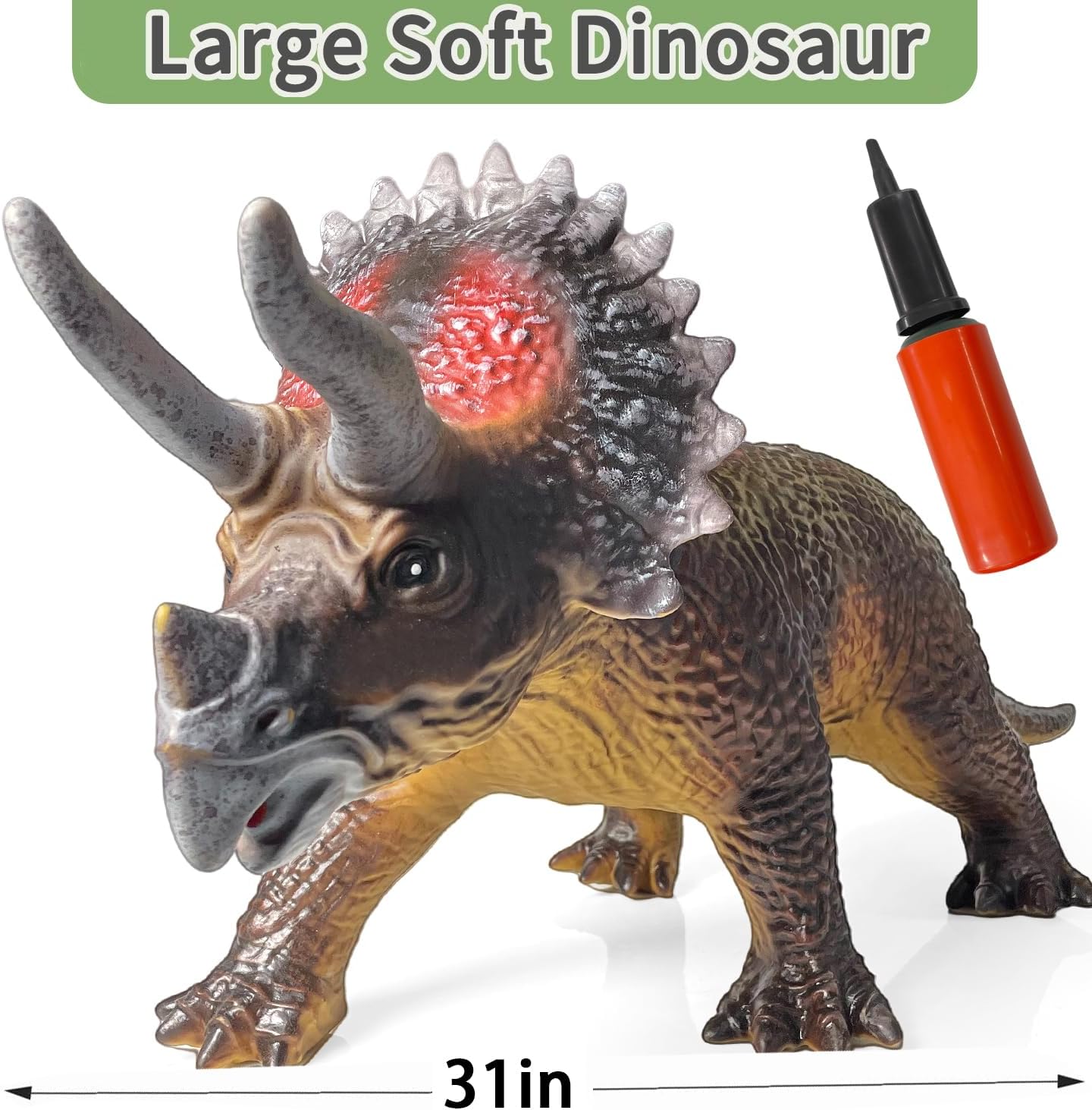 Large Dinosaur Toys:Dinosaur King Giant Triceratops approximate size of the dinosaur is 32 inches. The texture is clear, without fading, and has a very real bumpy feeling(The shape and feel are almost identical to that of a non-inflatable dinosaur), You can let your child enjoy the real fun that the world of dinosaurs has to offers