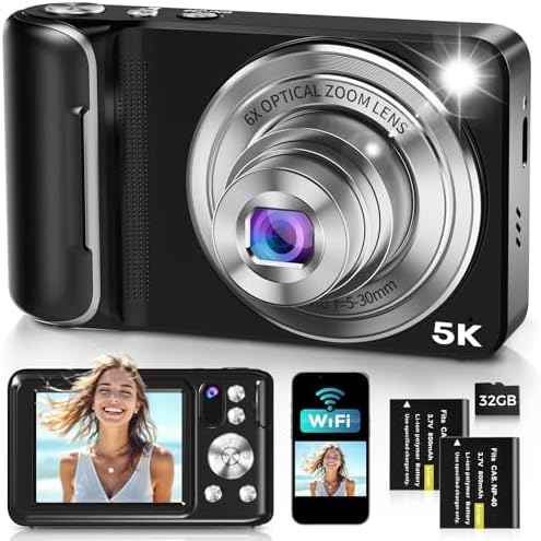 5K Digital Camera for Photography, WiFi 64MP Autofocus Dual Lens Vlogging Camera with Touch Screen, 6X Optical Zoom Compact Point and Shoot Cameras for YouTube, 32GB Card,2 Batteries,Black