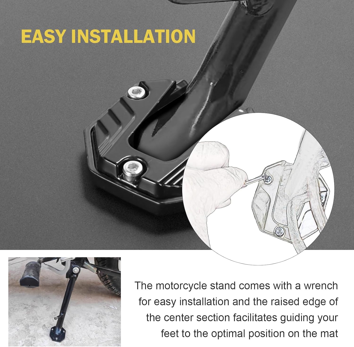 Design: This kickstand pad uses anodized coloring technology to effectively increase wear resistance and hardness, and also adds a stylish black finish, which is not only powerful, but can also be used as a decorative piece for your motorcycle to enhance the overall look and appeal of your motorcycle.