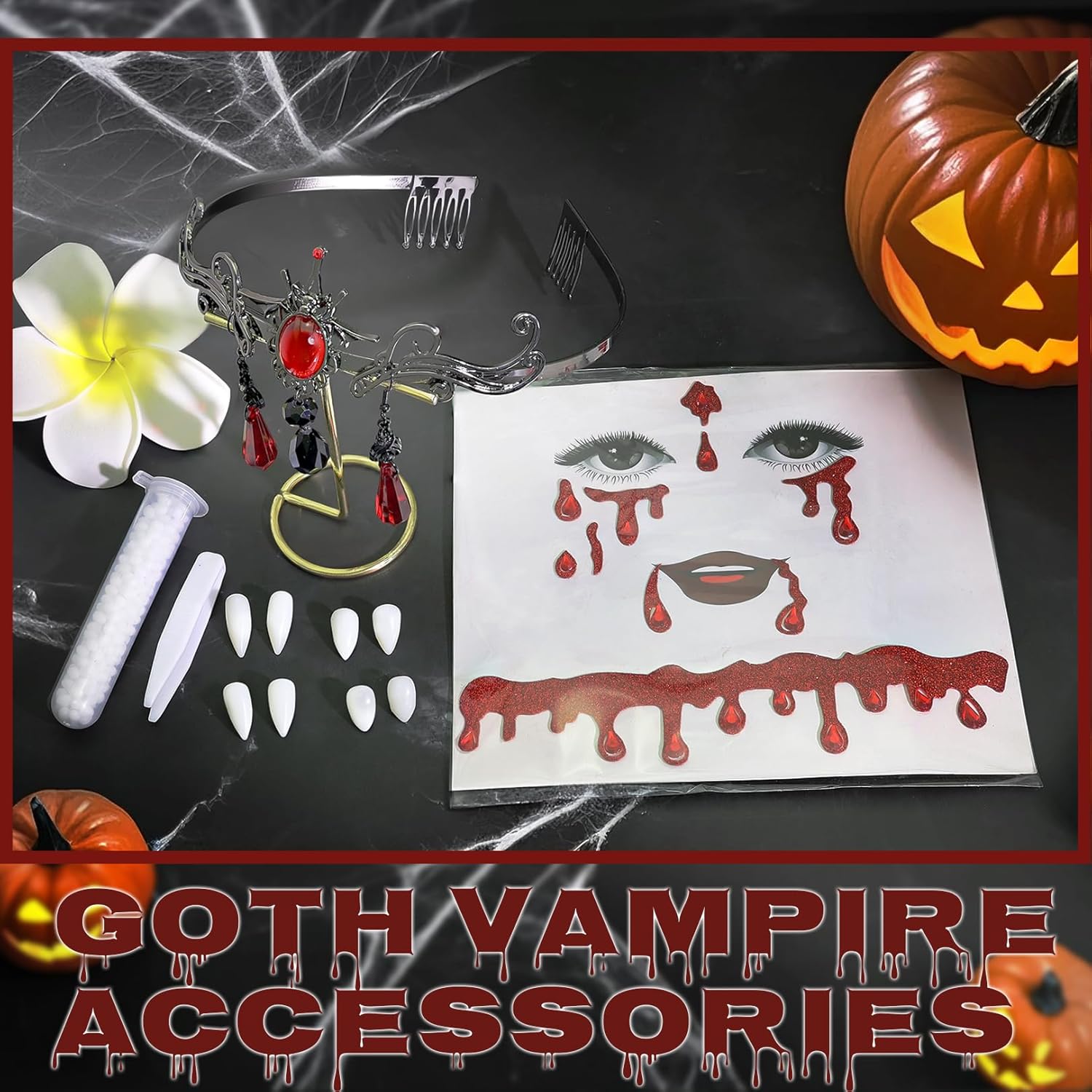 6 Pcs Goth Vampire Accessories with 4 Sizes Vampire Fangs Dark Bat Vampire Earrings Vampire Red Stone Comb Headpiece Tiara Halloween Costumes Makeup Props for Women Party Cosplay