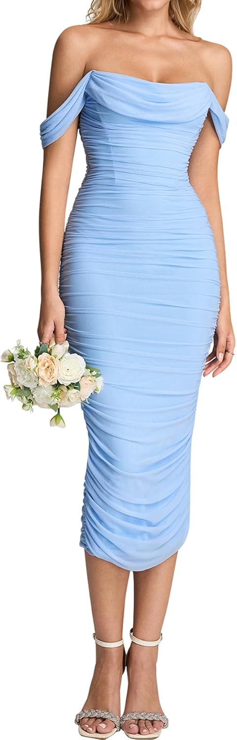 KUTUMAI Off Shoulder Corset Formal Wedding Guest Dresses for Women Elegant Bodycon Ruched Cocktail Party Midi Dress