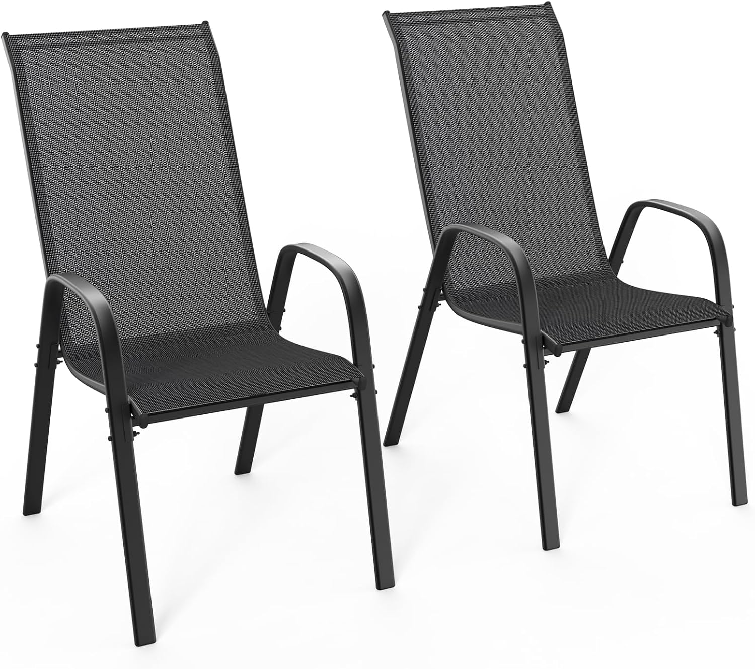 VINGLI Patio Chairs Set of 2 – Stackable Outdoor Dining Chairs with Comfortable Sling High Back Chairs and Armrests for Lawn, Poolside, Courtyard, Balcony, Garden, Black