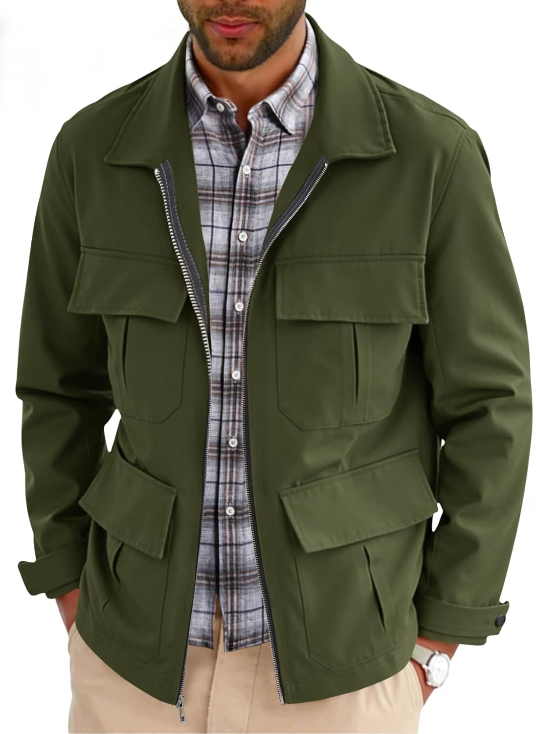 Runcati Mens Safari Jacket Military Full Zip Cargo Jacket Windproof Multi Pocket Outdoor Field Coat