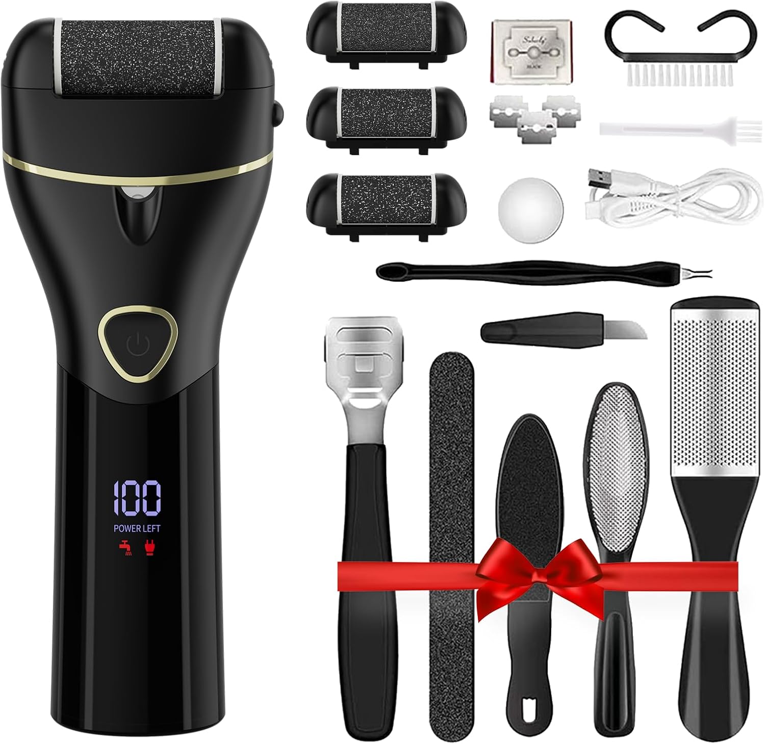 Electric Foot Callus Remover Rechargeable - 12 in 1 Pedicure Kit with 3 Rollers, Portable Foot File Scrubber for Dead Skin Removal, Waterproof & Painless, Home Foot Care Tool (Black)