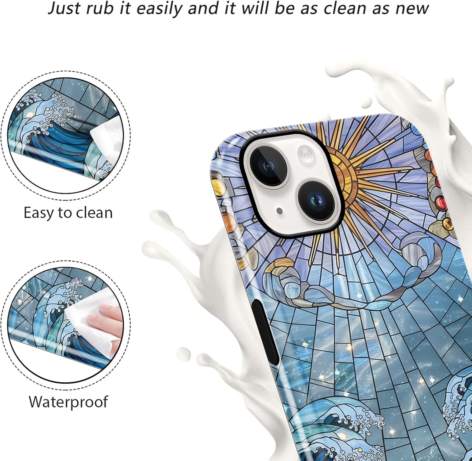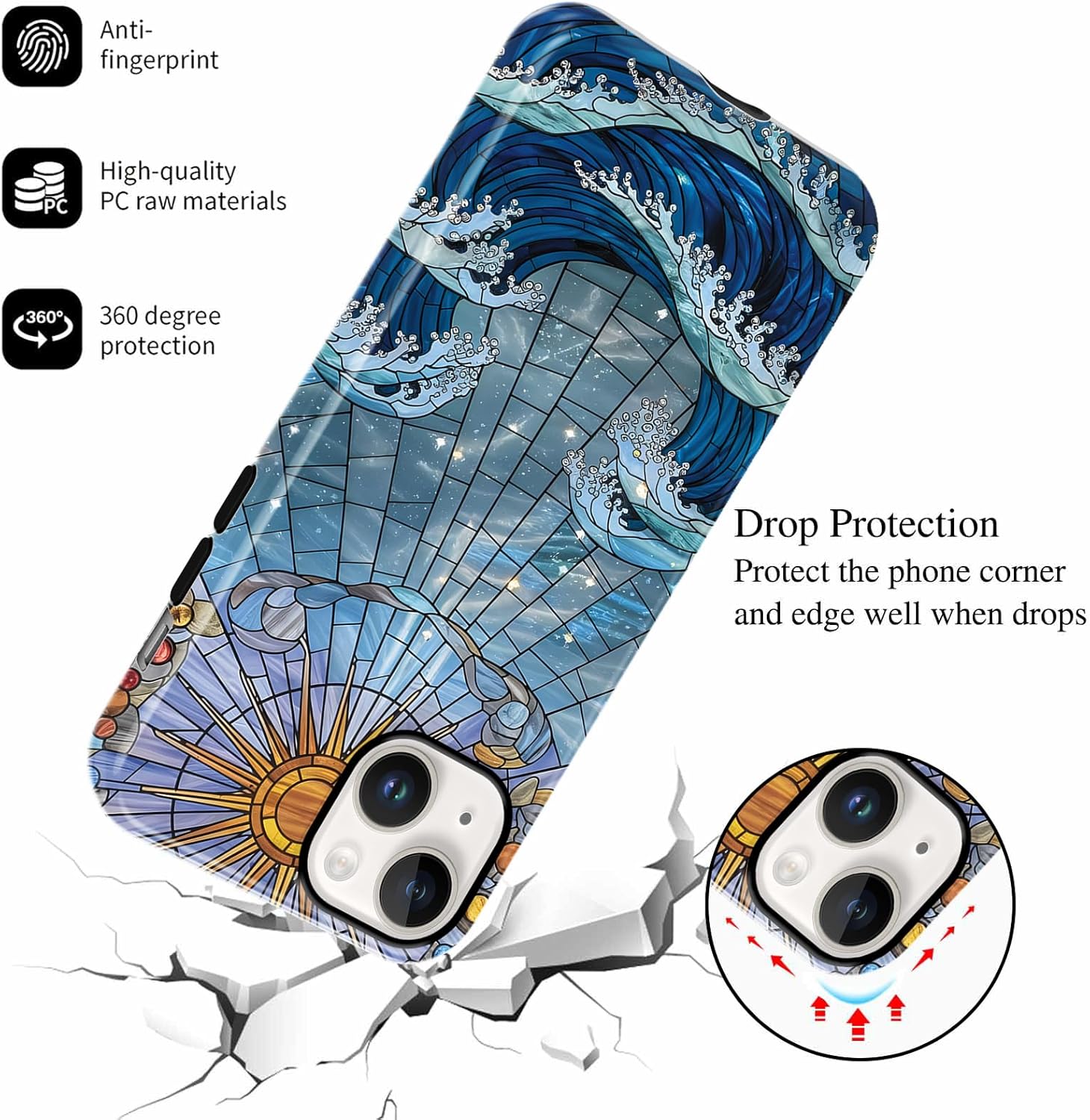 Aesthetic Phone Case for iPhone 14/iPhone 13 6.1",Cute Retro Ocean Waves Sun Rays Stained Glass Print Cases Trendy Cover for Women Girls,Hard PC Soft Slim Protective Funda for iPhone 14/13