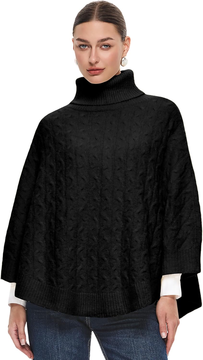 PULI Women Luxury Turtleneck Sweater Poncho Fashion Thick Cable Knit Cape Wrap Pullover Chunky Warm Shawl for Fall Winter