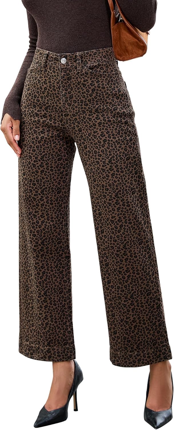 luvamia Wide Leg Jeans Woman Trendy High Waisted Leopard Cheetah Print Ankle Length Stretchy Denim Pants with Pockets