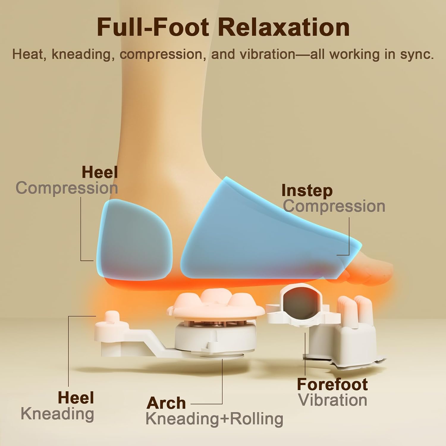 【Targeted Kneading & Compression Pressure】 This deep kneading foot massager uses rotating rollers to cover key areas of the forefoot and heel, delivering full-coverage pressure to stimulate pressure points. At the same time, bags wrap the top and sides of your feet, inflating and deflating rhythmically to create a complete compression sensation. This coordinated motion mimics a therapist’s hands—your instep receives full-wrap compression while your soles are thoroughly kneaded. With 3 kneading speeds and 3 pressure levels, you can fine-tune comfort to ease tension, reduce fatigue, and support healthy circulation—ideal post-workout, during TV time, or as part of your evening routine.