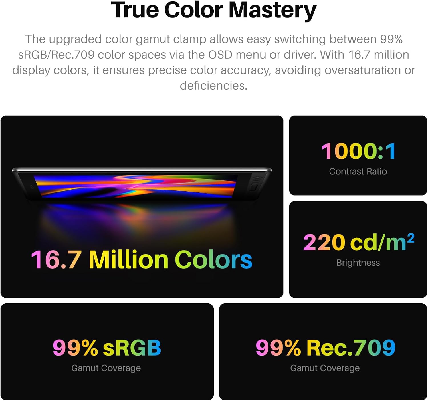 Slim, Light & Ready Anywhere: At just 0.453 in thick and weighing 2.65lb, this drawing monitor display is slimmer than the old version. The included ST200 aluminum stand offers six angles (14.5°-45°) with anti-slip pads, enabling ergonomic creation anywhere.