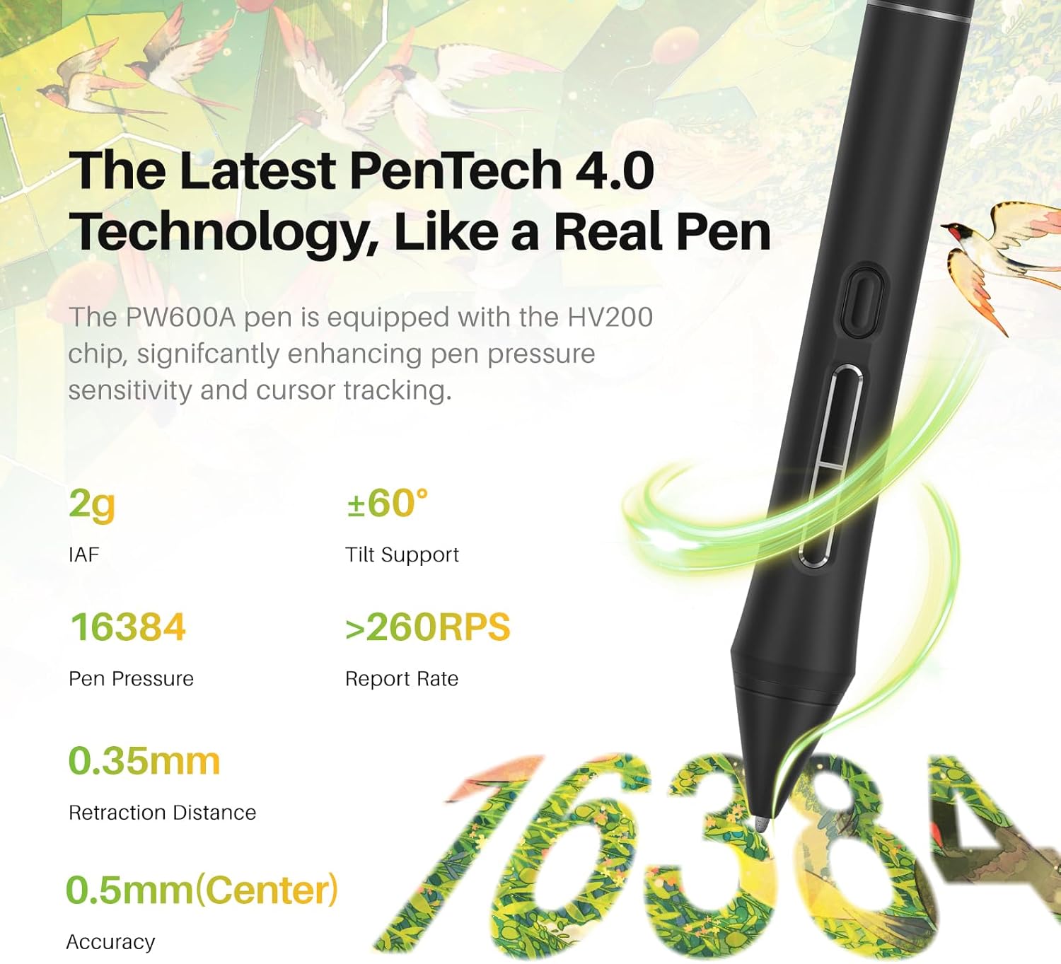 Pixel-Perfect Pen Precision: The battery-free PW600A with Pentech 4.0 offers 16,384 pressure levels and 5080 LPI resolution for capturing the finest details and most nuanced strokes.With three side keys and a dust-proof grip, it not only provides a real pen-like experience but also boosts effciency.
