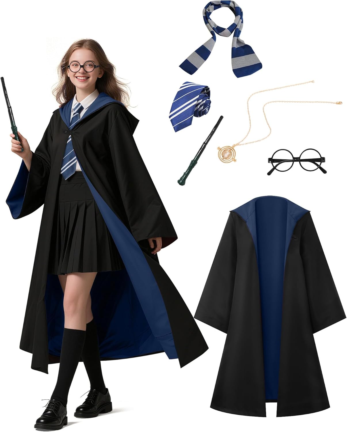 Unisex Magic Hooded Robe Wizard Cloak Adult Kids Halloween Costume for Women & Men Wizard Wand Ccarf Glasses Tie Set