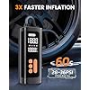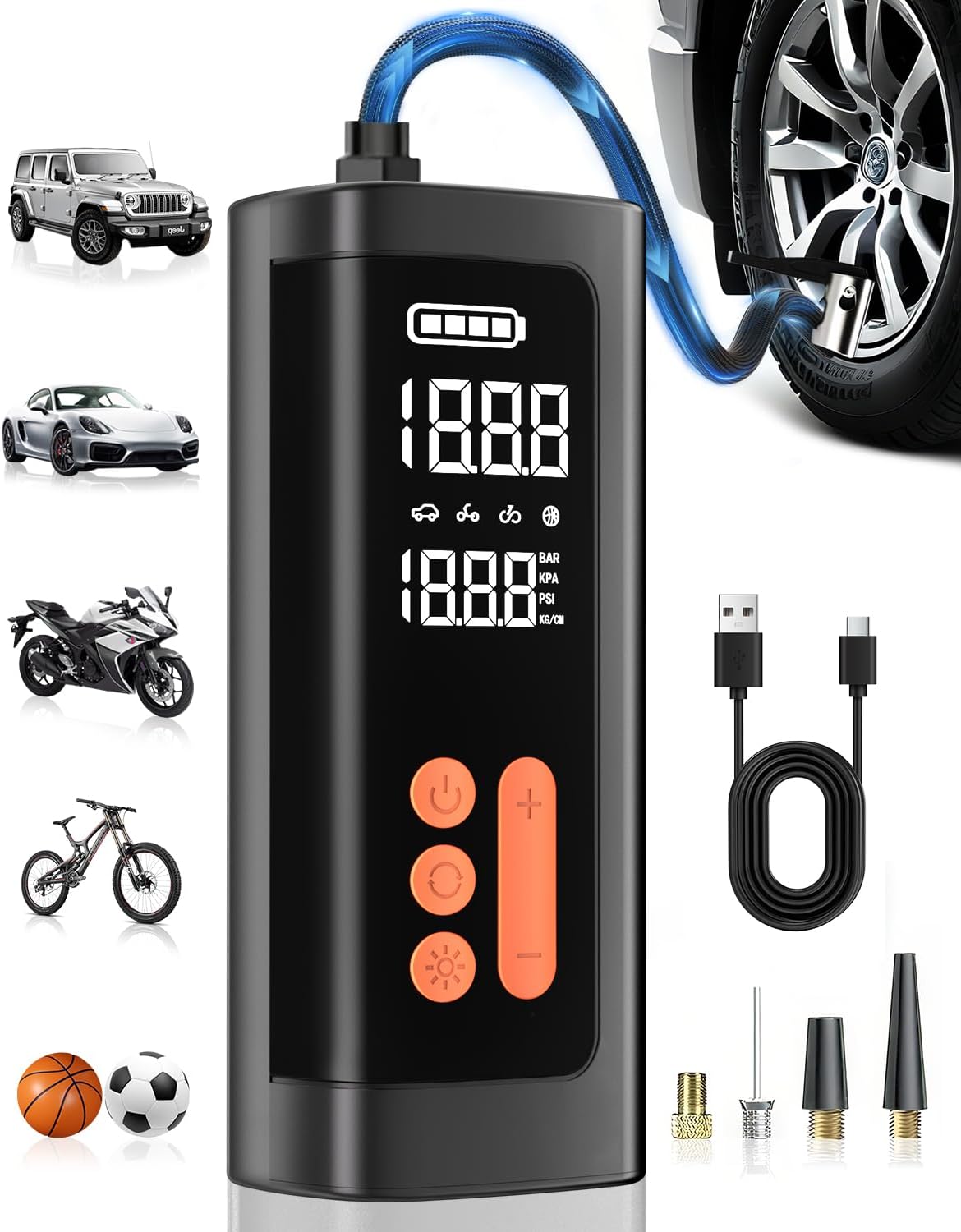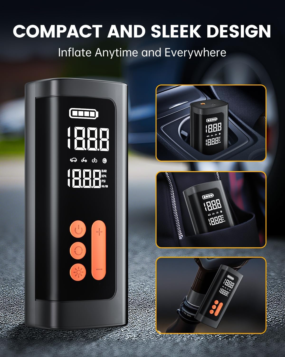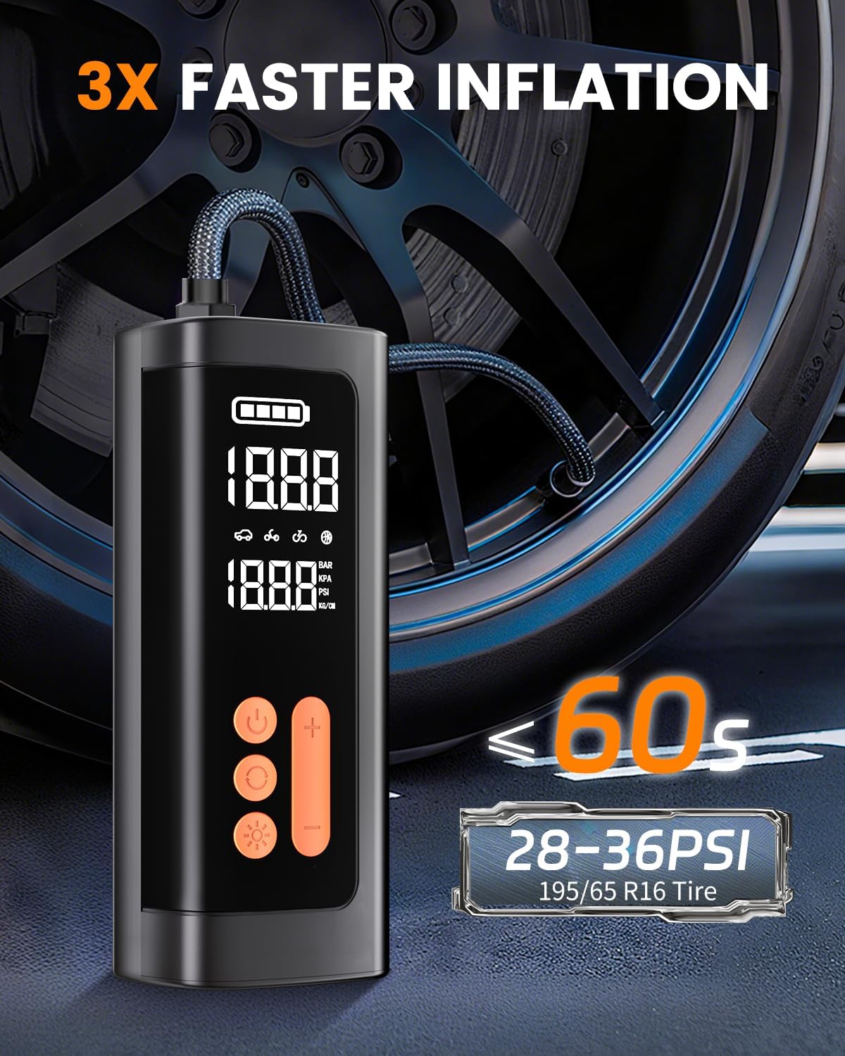【Faster Inflation & 150PSI High Power】 Portable tire inflator of the standout feature is definitely its 3X faster inflation speed. It will take a nearly-flat 3.5PSI basketball up to 8PSI in perhaps 30s -- and that's a lot more convenient than using the hand pump for minutes.air compressor powered by a rechargeable battery, tire air pump ensures quick, cordless inflation anytime—perfect for emergencies, road trips, or outdoor adventures. tire pump works effortlessly on cars, bikes and inflatables