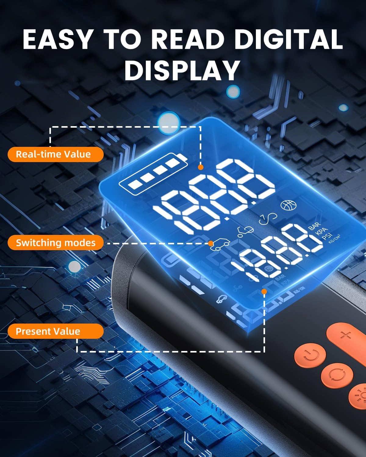 【5-in-1 Versatility &Auto Shut Off】It's easy to change between PSI, kPa, BAR, and KG/CM pressure units with a long push of the conversion button; Four preset modes for car, motorcycle, bicycle, and ball. A fifth custom mode lets you set pressure from 3-150 PSI based on your various inflation needs, making it easy for even beginners to operate. Easily inflated to 70PSI, and the auto shut-off function prevents overinflation, which adds peace of mind