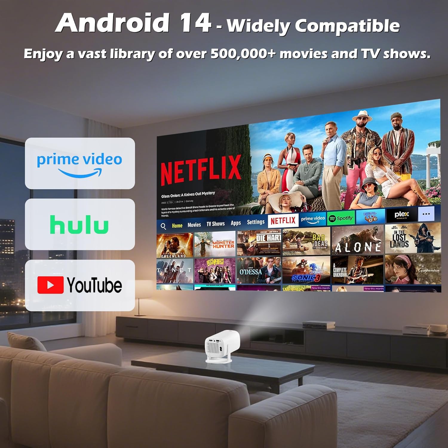 Smart Projector with Android 14: The projector is equipped with the advanced Android 14 system, 1G+8G running memory, relying on the optimization and upgrade brought by the new system architecture to bring you a smoother user experience