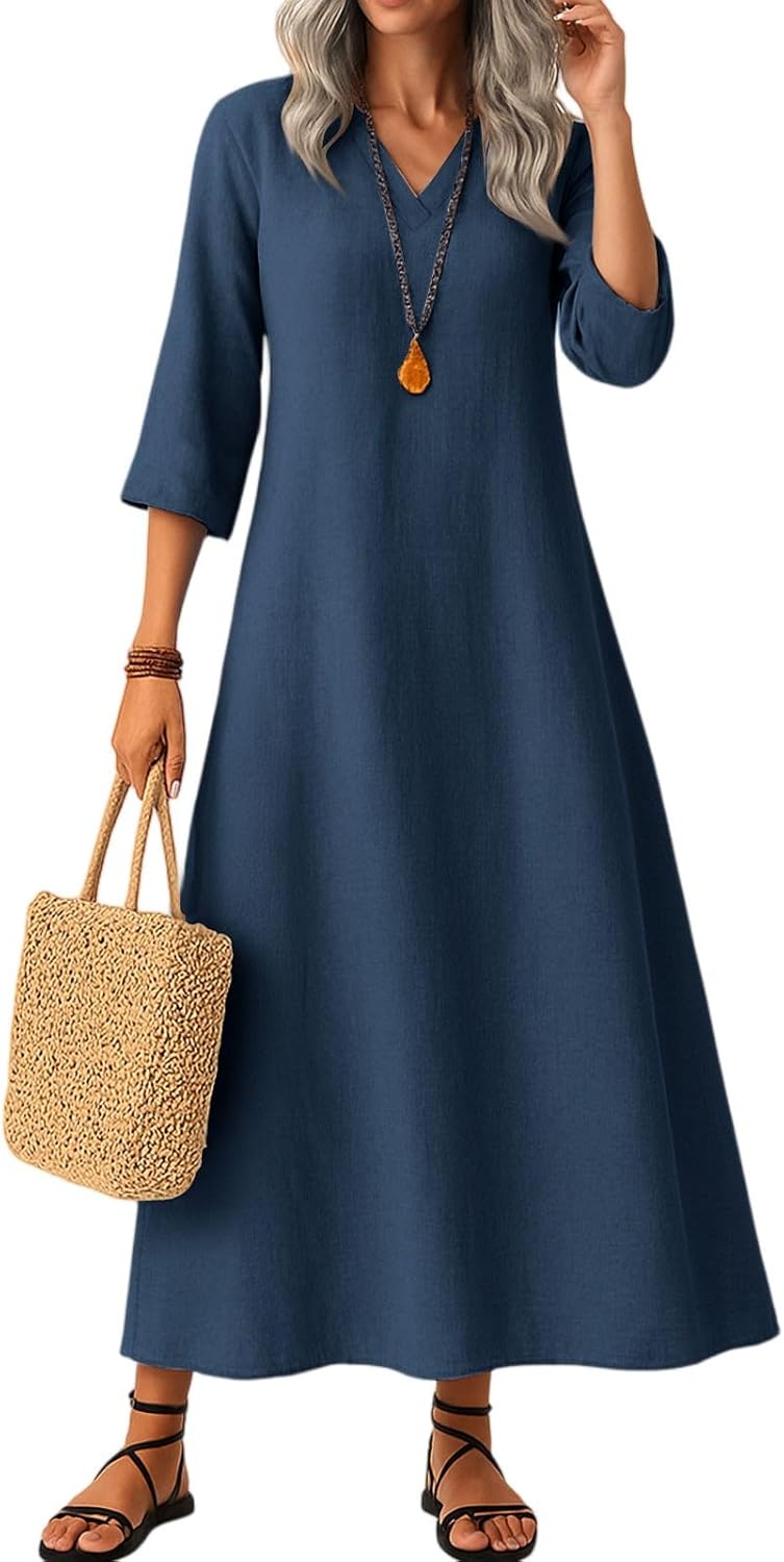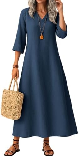 Cotton Linen Dresses for Women Flowy V Neck 3/4 Sleeve Maxi Shift Dress Lightweight Business Casual Work Outfits