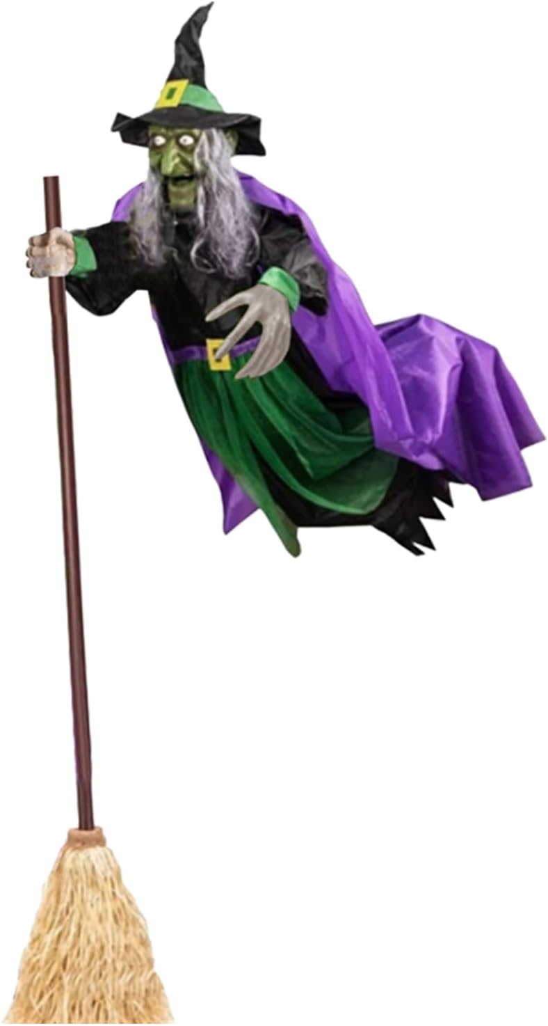 Flying Hover Witch: The Flying Witch Halloween Decor on Broom can float and hover in the air, leaving your guests in awe. Get close to it, and it emits scary light and and produces sound with built-in batteries, creating an incredibly realistic flying effect, and adding to the horror atmosphere of Halloween night