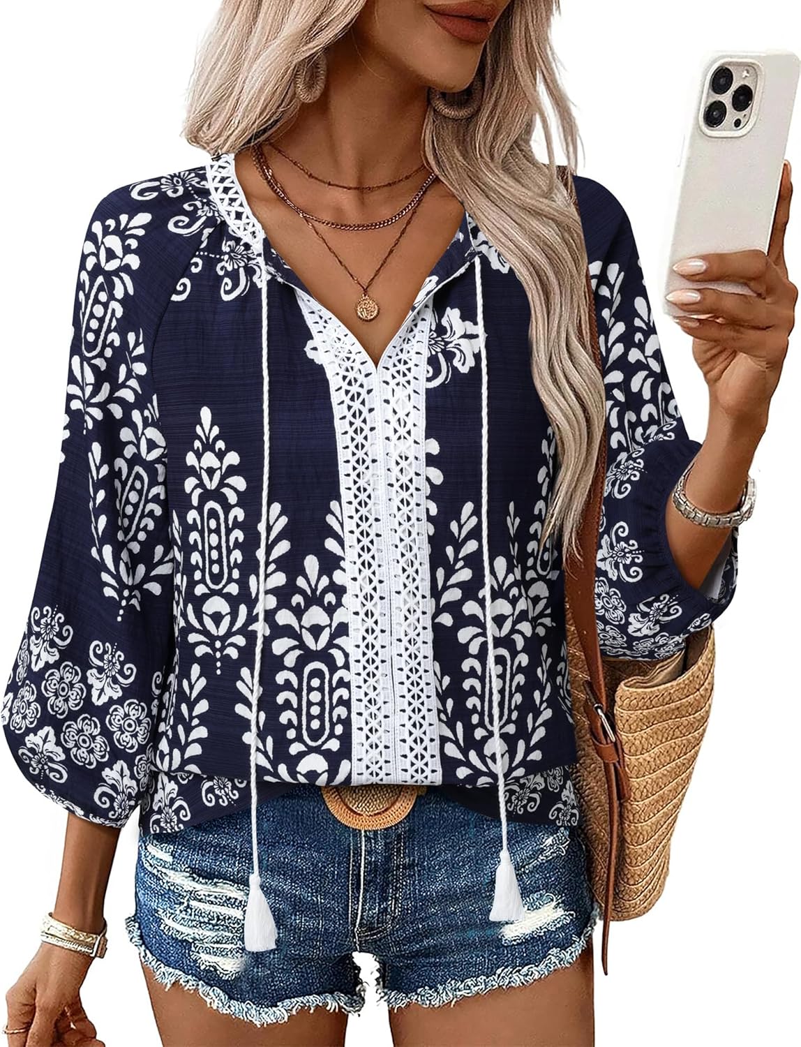 Gaharu Women's 3/4 Sleeve Boho Tops Casual V Neck Floral Print Loose Fit Blouses Tunic