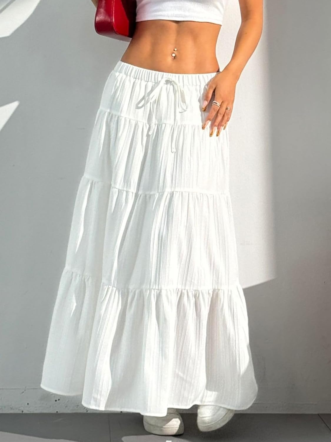DERAX Women's Boho Flowy White Maxi Skirt Flared Ruffle Elastic Waist Summer A Line 2026 Spring Long Skirts