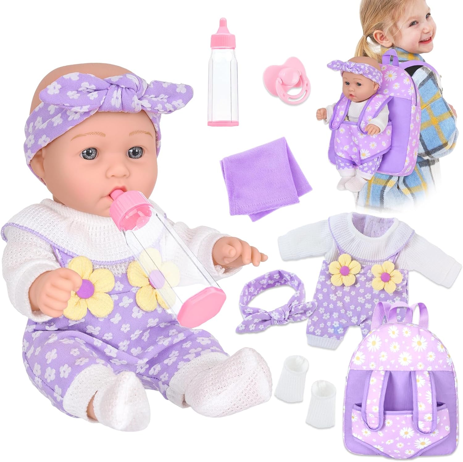BABY DOLL SET LIST:This adorable baby doll playset include 12 inch(31cm) baby doll with beautiful daisy flower pattern clothes outfits as picture, 1 daisy backpack,1 feeding bottles,1 pacifier,1 purple hanky. All package in a beautiful gift box! It's a delightful addition to any doll collection【please check the size of the doll before purchasing】