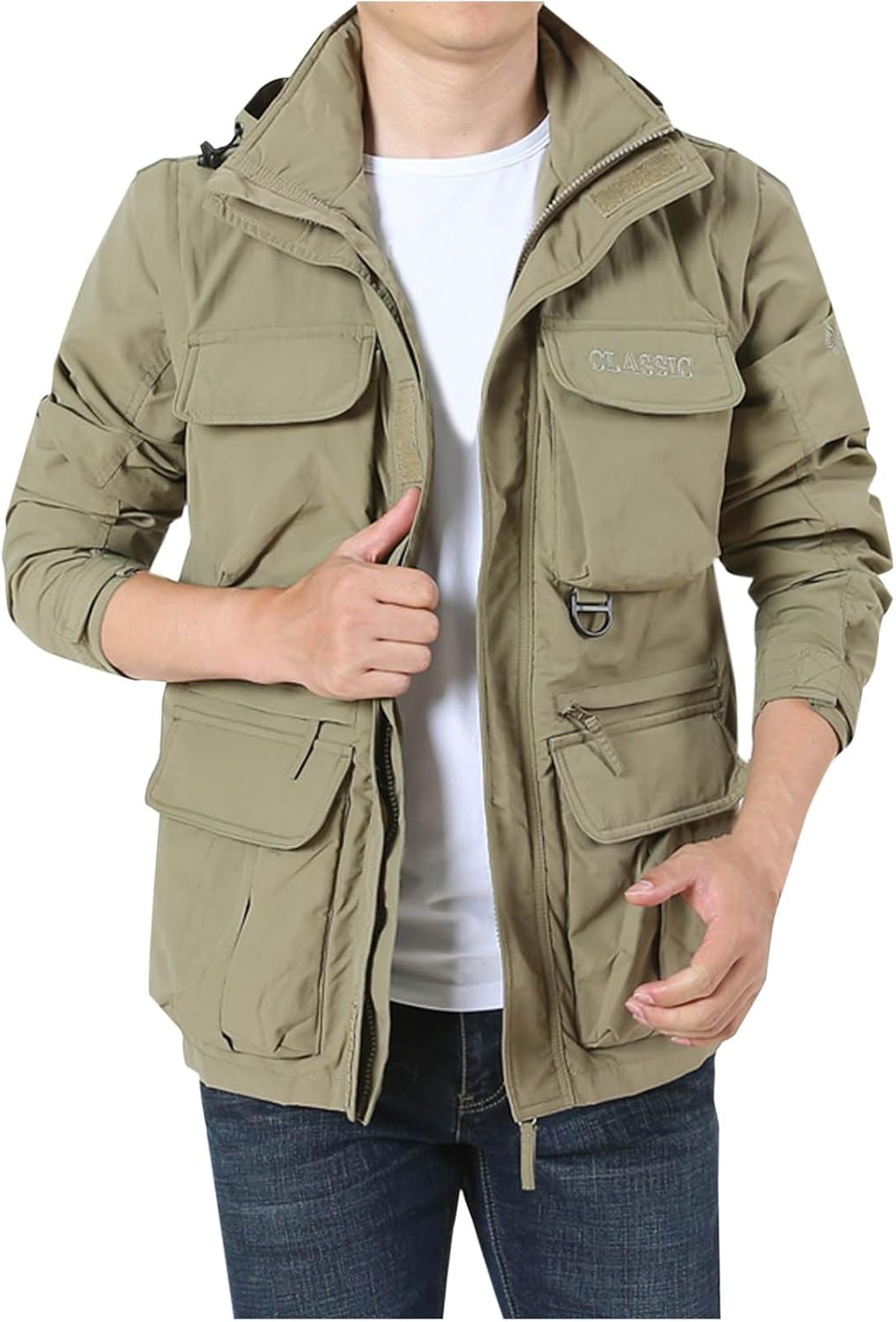 Mens Safari Jacket Hooded Outdoor Military Cargo Jacket Casual Lightweight Windproof Multi Pocket Fishing Hiking Coat