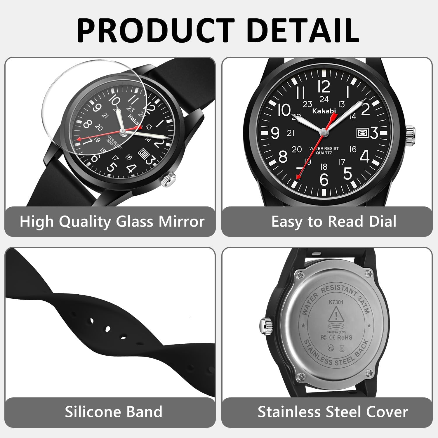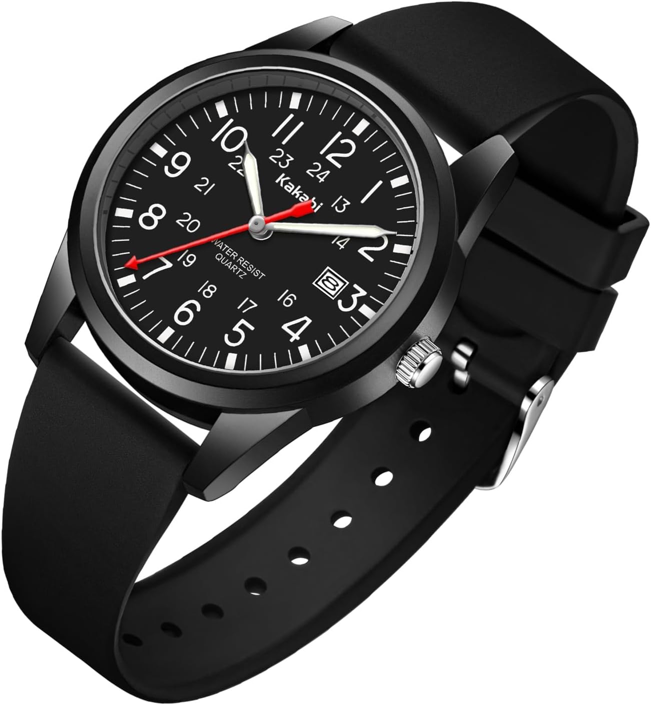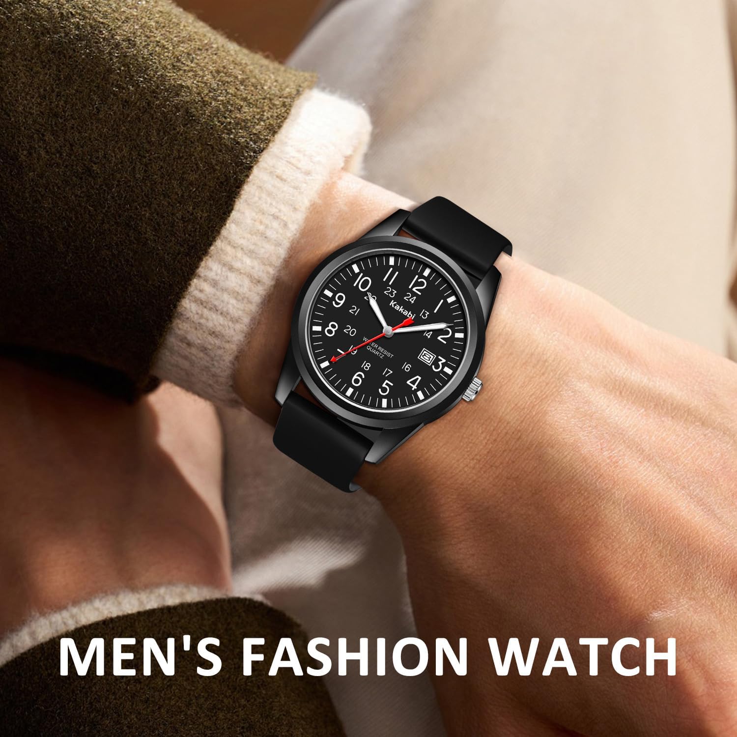 Men's Easy to Read Watch, Unisex Military Sport Analog Quartz Casual Wristwatch with Comfortable Silicone Strap, 24 Hour Time, 30M Water Resistance