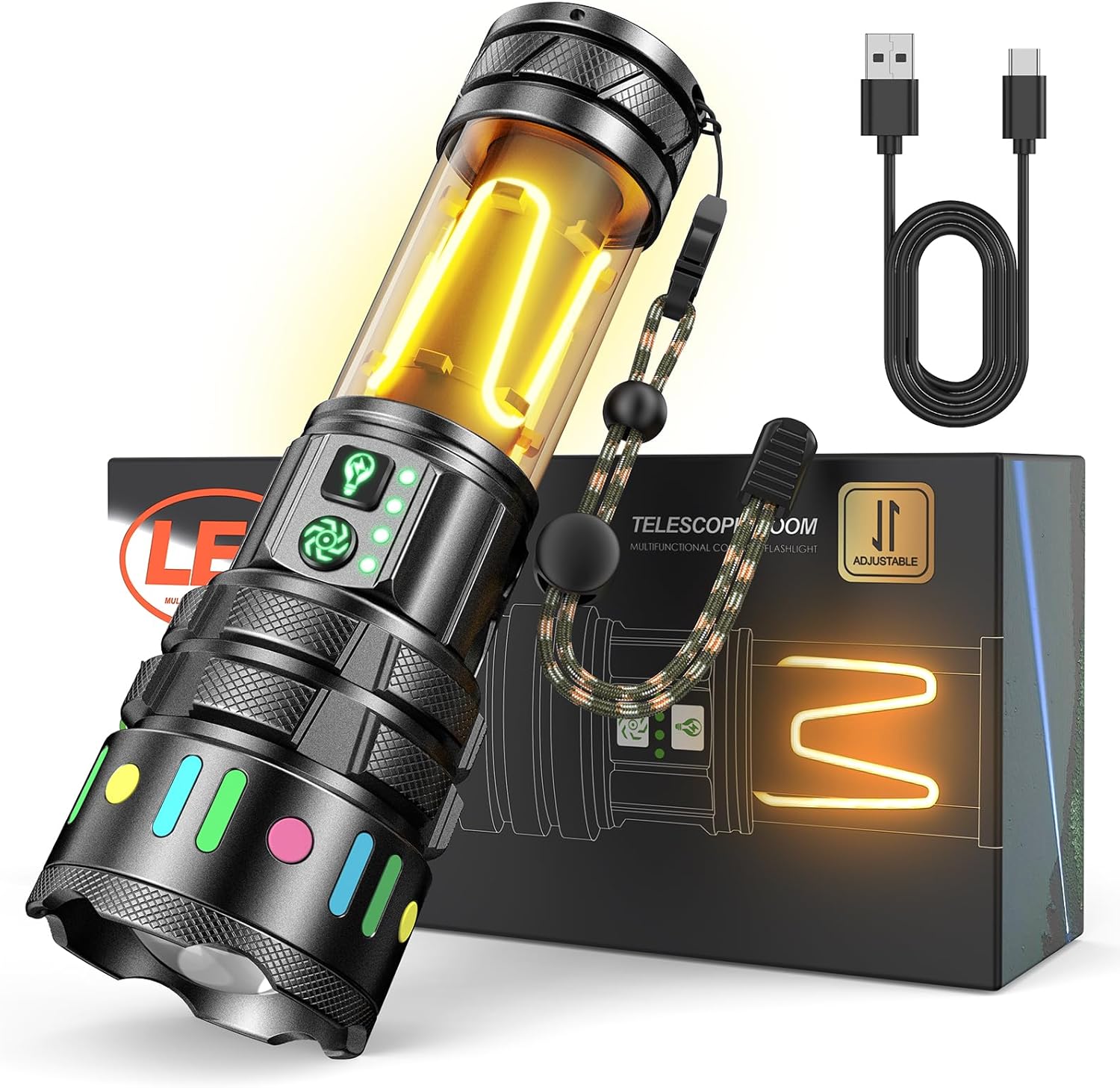 【11 Modes & Adjustable Zoom】High powered flashlight has 5 main modes: high/medium/low/strobe/sos, 3 camping light modes and 3 warning light modes, you can adjust the brightness and mode you need according to the usage. The head of the rechargeable flashlights can be retracted, elongate the head to focus the light beam into a point, contract the head to enlarge the irradiation range to illuminate the whole room.
